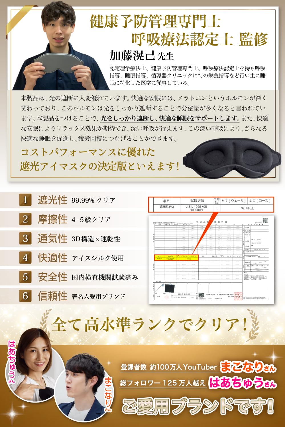 特徴 軽量・99.99%の遮断・健康予防管理専門士 /呼吸療法認定士の睡眠のプロ監修