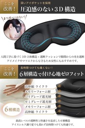 ???【累計85万個突破の寝具ブランドだからこそ実現】素材にアイスシルク調を採用し、快眠のために長時間の付け心地にこだわりました。最高級ライクラ素材からなる6層構造が目元を包み込み、つけ心地0を再現、3D立体構造のアイポケットによりマツエク、アイメイクをしていても気になりません。鼻翼に合わせてクッションを設定しもっちりと密着。これにより僅かな光も通さないのがSAEGIRIアイマスクの特徴です。