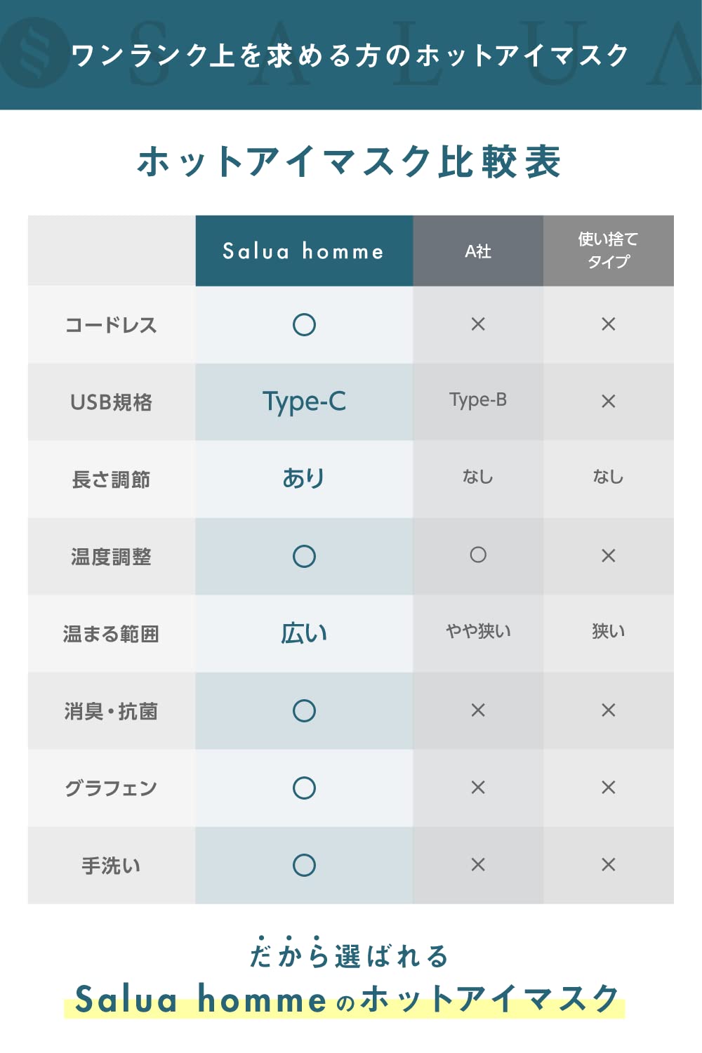 ?【こだわりの機能満載】Saluaホットアイマスクhommeは洗濯可能のアイマスクカバー入り!いつでも洗えて、常に清潔。出張や長時間の移動時も手軽に持ち運びが可能。可変アジャスター付きでサイズ調整ラクラク♪頑張り続けるあなたに…ワンランク上のリラックスタイムをお届けします。