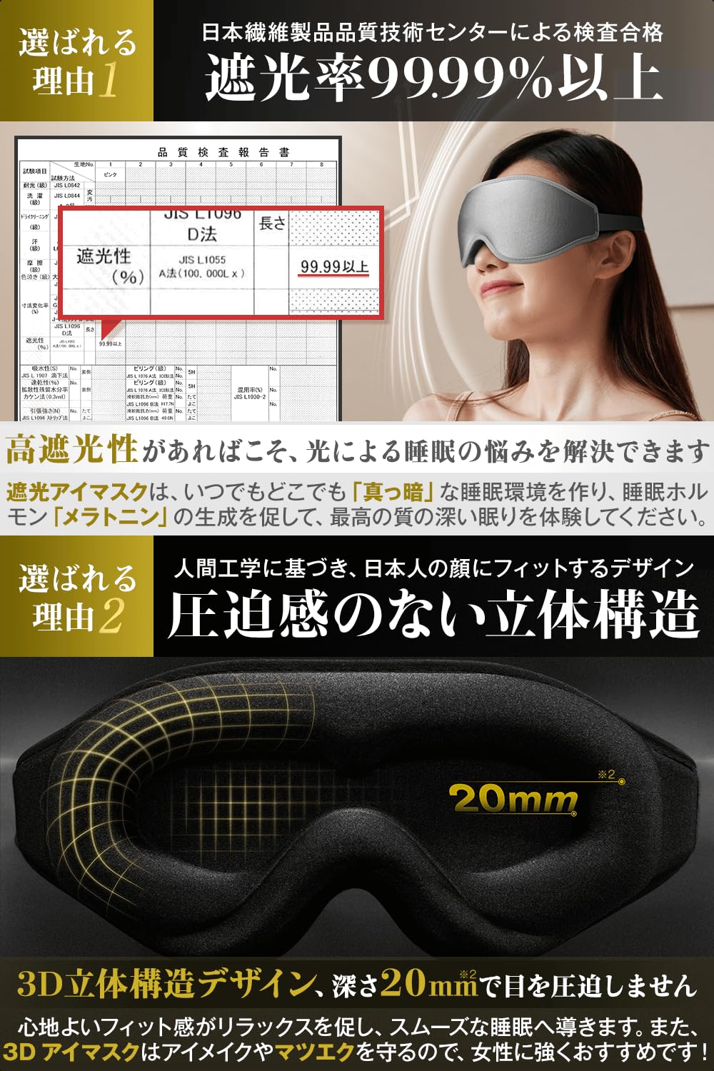 ??【国内認証済み????・遮光率99.99%】最高クラス1級の遮光性が外部の光をほぼ遮断し、本当に「真っ暗」な体験をあなたの目で確かめてください。暗い睡眠環境がメラトニンの生成を促進し、スムーズな睡眠へ導きます!(暗闇が怖くない方におすすめ)