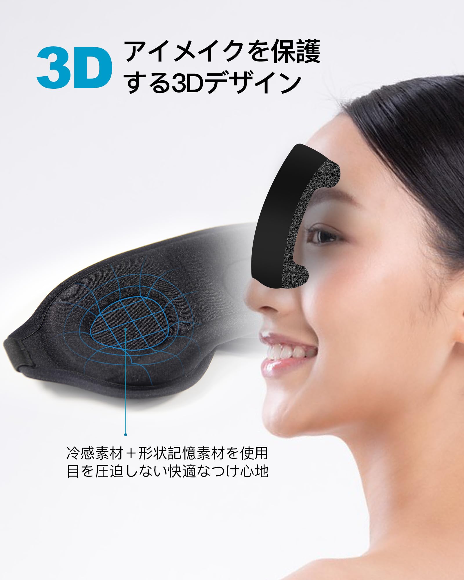 【柔らかさと通気性】 アイマスク 睡眠用は高密度低反発形状記憶素材を使用しています。アイマスク 睡眠用 夏 直接肌に触れる部分には冷感素材を使用しており、優しく包まれているような肌触りです。 一般的な睡眠用アイマスクよりも柔らかく、軽く、通気性に優れています。出張時の道中の仮眠や昼寝などにおいて、試供品の耳栓も合わせて利用することで、質の高い睡眠をとれ、疲労が癒されるでしょう!