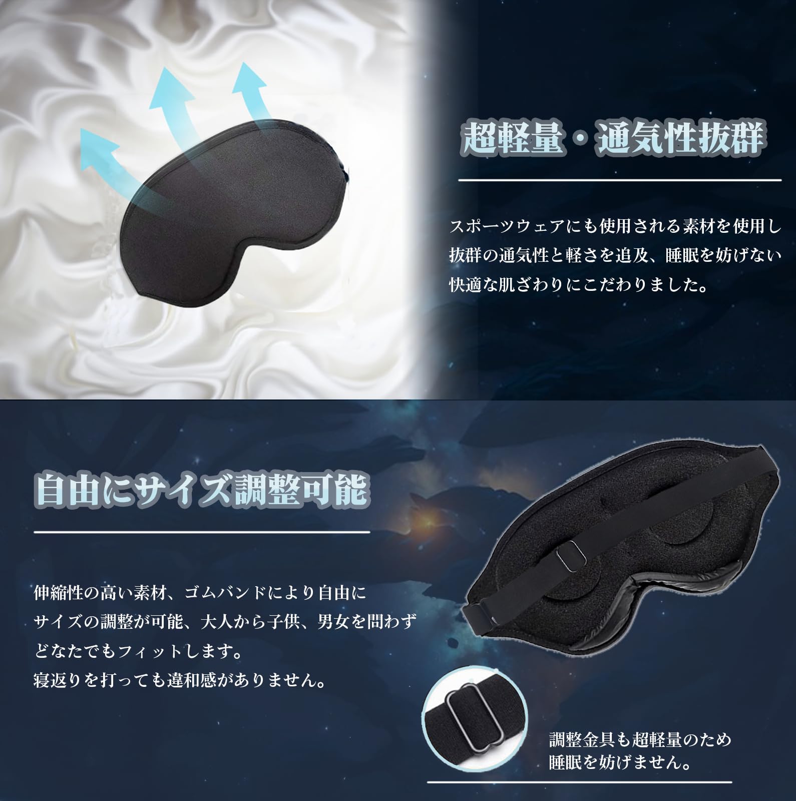 ?【 長さ調節可能 締め付けの少ない 快眠マスク 】本体は 人体工学 に基づいた 立体 3D 構造設計でゴムバンド部は アジャスター により サイズ調節 が可能となっており老若男女ご自身の理想の 着け心地 でご使用いただく事ができます。※乳幼児の手の届かない場所に保管してください。小さなお子様はゴムバンド部による窒息の可能性があります※