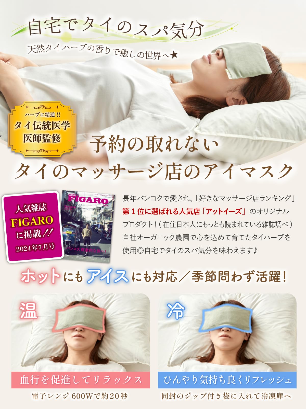 【予約の取れないタイのマッサージ店のアイマスク】ハーブに精通したタイ伝統医学医師監修!長年バンコクで愛され、日本語フリーペーパー発行部数1位の雑誌調べでも「好きなマッサージ店ランキング」第1位に選ばれる人気店「アットイーズ」。その「アットイーズ」が開発したオリジナル商品です。自社オーガニック農園で心を込めて育てたタイハーブを使用◎自宅でタイのスパ気分を味わえます♪天然タイハーブの香りがアナタを癒しの世界へと誘います☆ *匂いに繊細な方はベージュをお選びください。緑豆のみの商品となります。