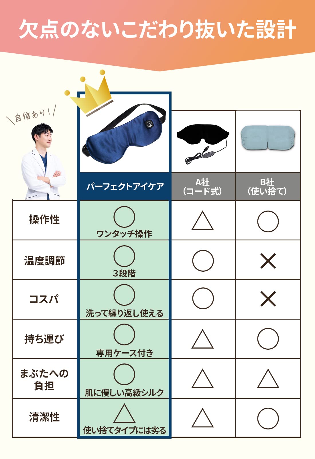 DocTrust パーフェクトアイケア ホットアイマスク 【現役眼科医が開発!】コードレス 充電式 USB 3段階急速加熱 高級シルク 睡眠用 遮光