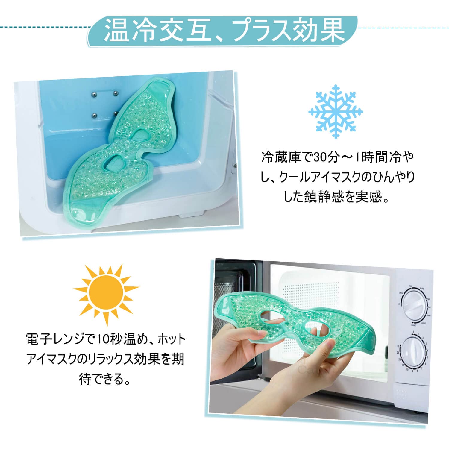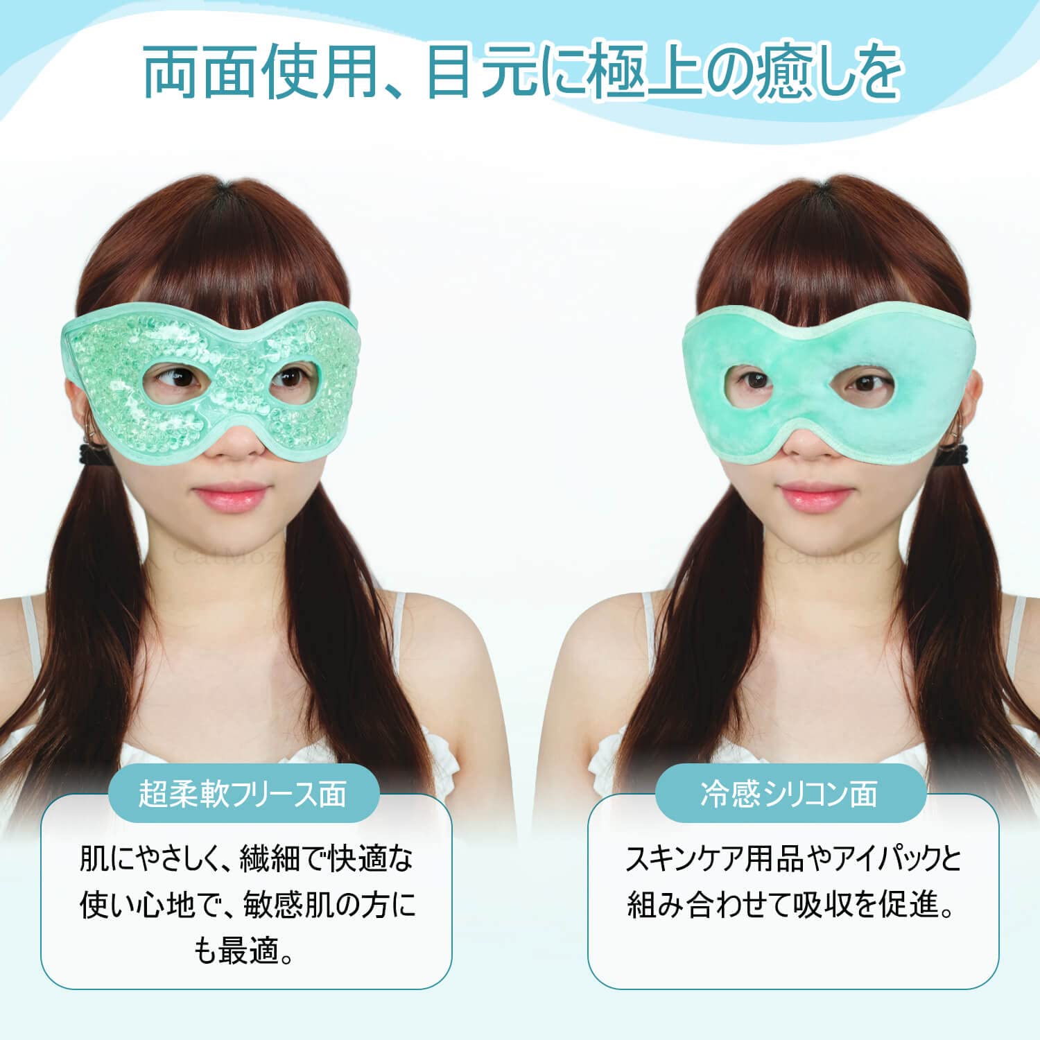 【温冷&両面で使える】 透明シリコン面:コールドクールアイマスクとして使用。好きなことをしながら、スキンケア製品やアイパックなどと組み合わせて使える。 フリース面:ホットアイマスクとして使用。肌にやさしく、繊細で快適な使い心地で、敏感肌の方にも最適。