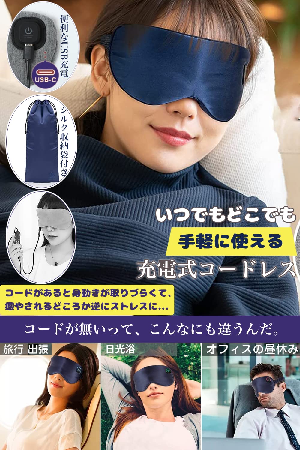 ?【極上なシルク100% &快適な眠りをサポート】アイマスク表面は、蒸れにくく肌当たりの優しい高級シルク100%。ラグジュアリーでリッチな肌触り。冬は暖かく、夏はサラッと涼しく快適!季節を問わず使いやすい アイマスク コードレス です。温めずにそのままアイマスクとして使うことで高い遮光性を発揮、あなたの 安眠 をサポートします。ホットマスクをカバーに入れたら、目元ケア機器に変身、仕事の終わりや就寝前などに、アイマスクをつけて目を休ませるうえ、集中ケアしてあげます。また、ベルトでサイズを調整でき、目元と耳は圧迫せずに顔にしっかりフィットできます。