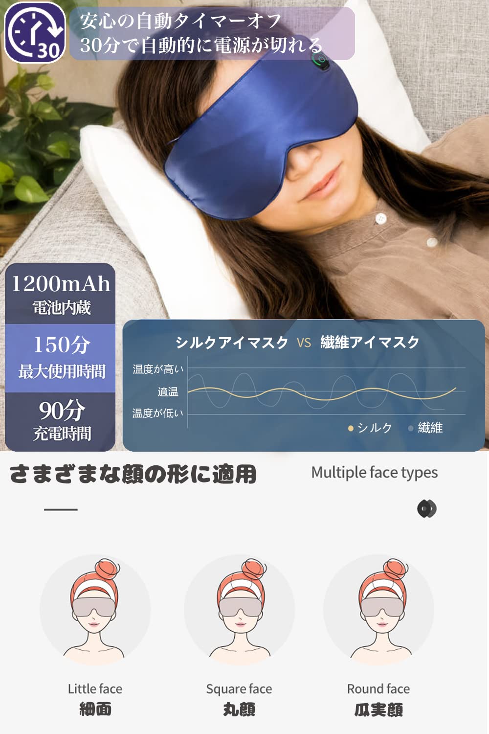 ?【便利なUSB充電式&どこでも使える】ホットアイマスクをフル充電して、一日30分の使用で、約7日間お使いいただけます。そして、切タイマー機能付きで、使用開始後30分経ったら、自動でシャットダウンします。消し忘れの心配がなく、つけて寝落ちしまっても大丈夫ので、快適にご使用いただけます。繰り返し使えるから、使い捨てのアイマスクよりもエコです。着け心地の良さを追求し、 USB の挿し口は表側、顔に当たらないように設計しました。サラサラふわふわ、優しく包み込まれるような極上の肌触りをお楽しみください。
