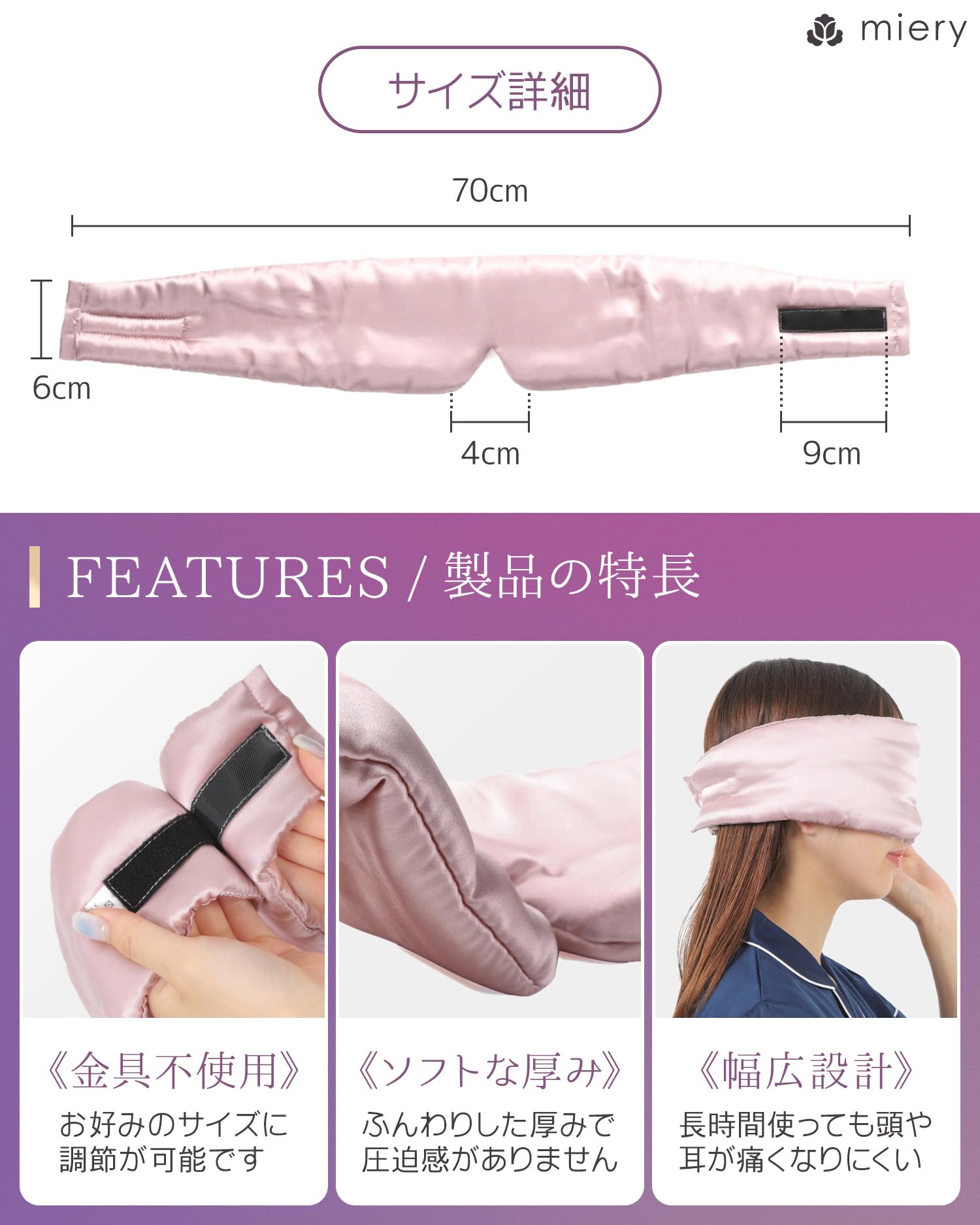 【製品の特長】《驚きの遮光力》顔にしっかりフィットして、光を効果的に遮断します。《金具不使用》お好みのサイズに調節が可能です。《ソフトな厚み》ふんわりした厚みで圧迫感がありません。《幅広設計》締めつけ感が少なく、長時間使っても頭や耳が痛くなりにくい。