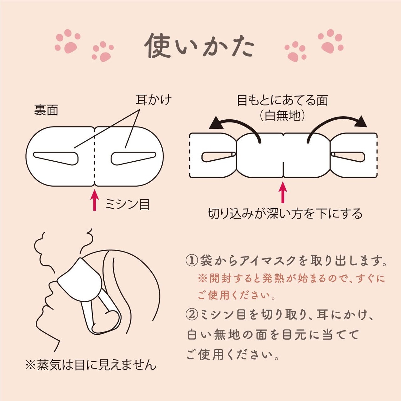 【 使い方 】1袋からアイマスクを取り出します※開封すると発熱が始まるので、すぐにご使用ください 2本体のミシン目を切り取り、耳にかけ、白い無地の面を目元に当ててご使用ください