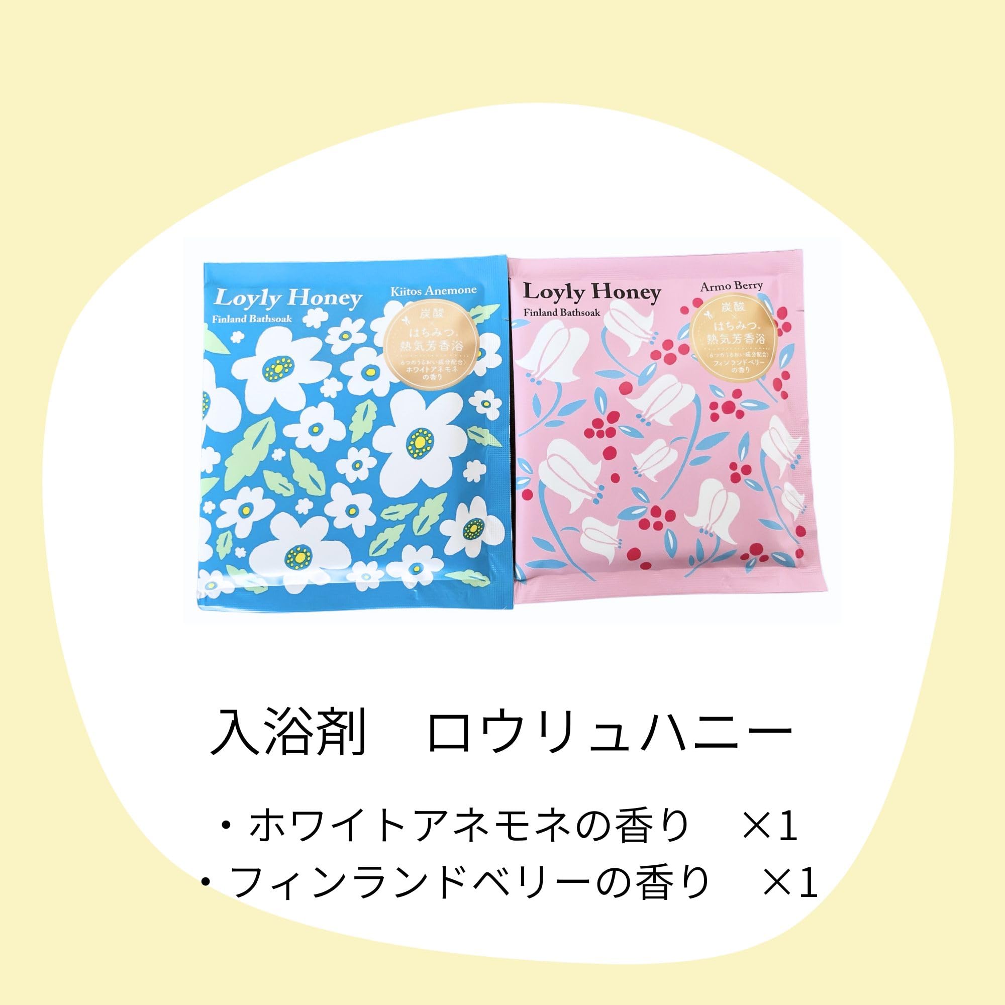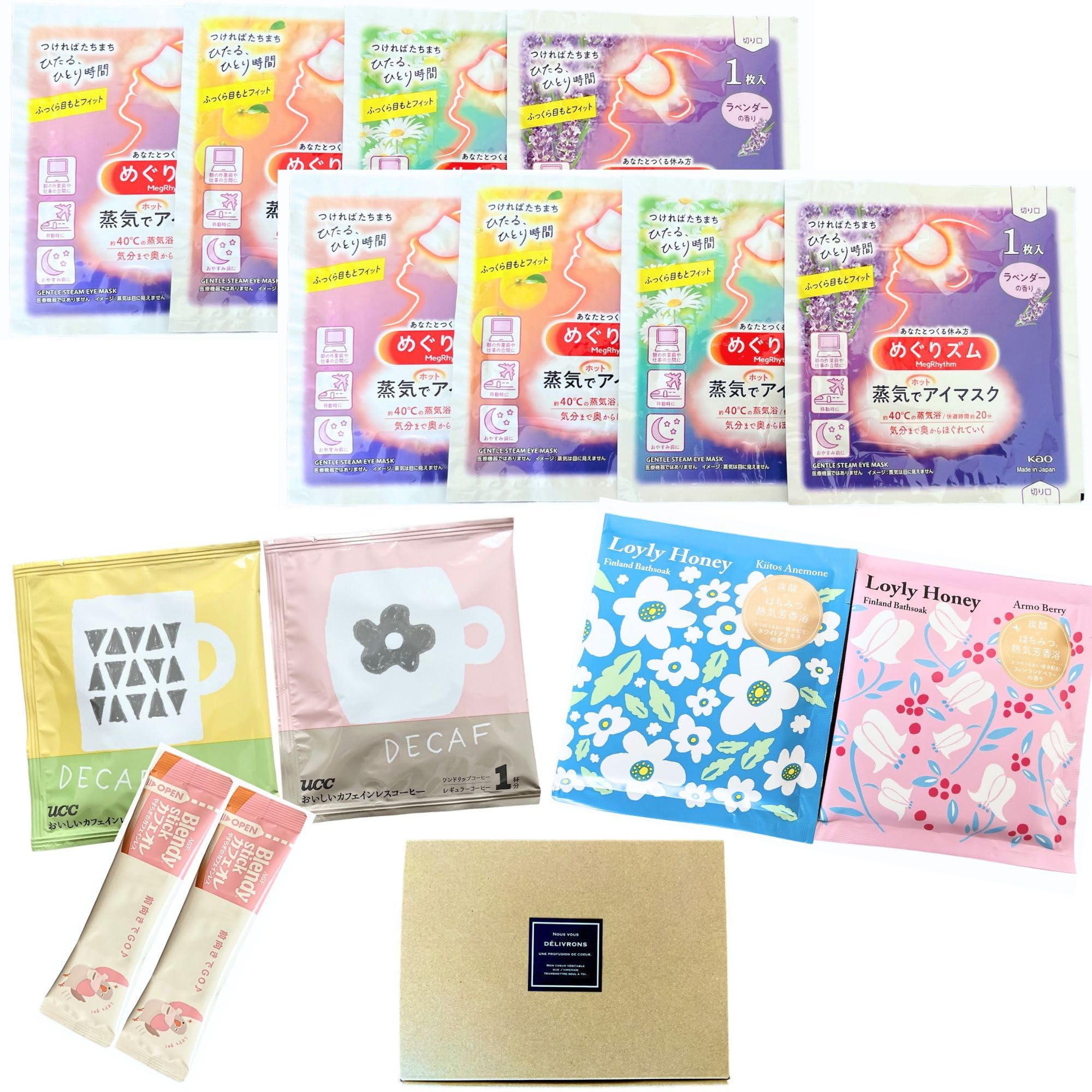 めぐりズム(無香料×2、完熟ゆずの香り×2、ラベンダーの香り×2、カモミールの香り×2)、ロウリュハニー フィンランド バスソーク(ホワイトアネモネ×1、フィンランドベリー×1)、UCCおいしいカフェインレスコーヒー×2、ブレンディやすらぎのカフェインレス×2