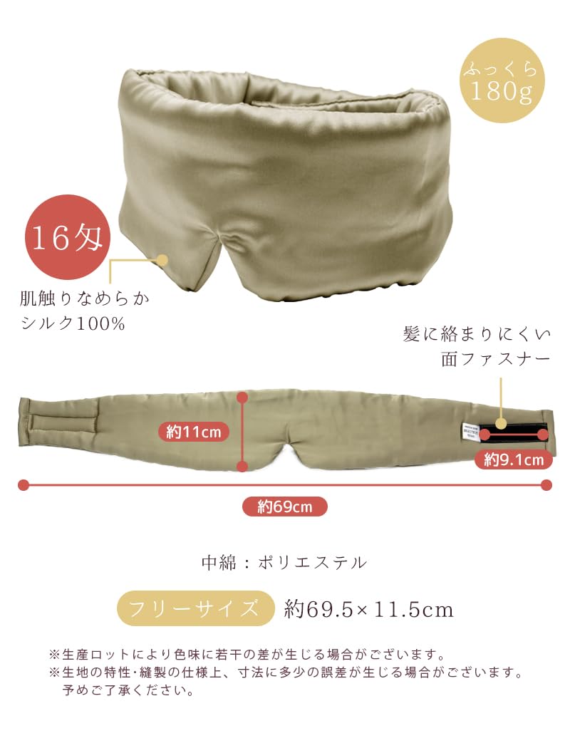 【着脱と長さ調節が簡単なマジックテープ】 目に対する圧迫感を軽減。髪に絡まりにくいマジックテープなので長時間使用でも痛くない! 【全面シルク素材で柔らかな着け心地】 快適に眠ることができるように耳まで覆い周囲の音を軽減し、心地良い睡眠をサポート。