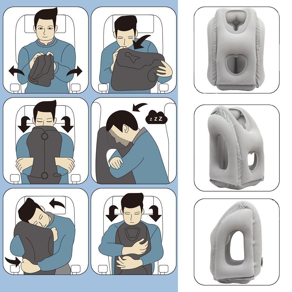 座ったままの長時間移動中でも楽にうたた寝ができる、空気注入式の立体型抱き枕です。