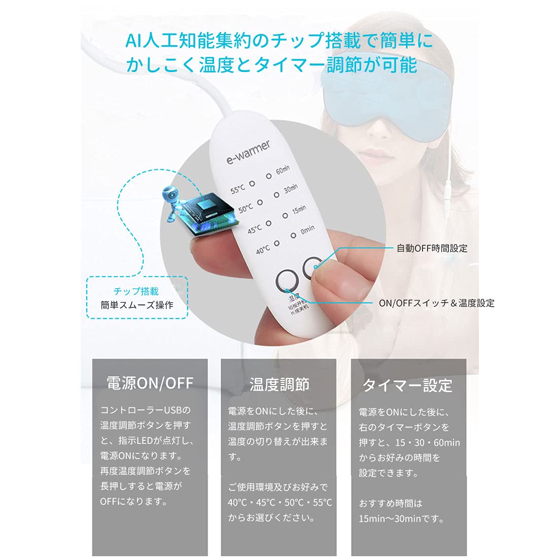 ・USB式で4段階の温度調節と温める時間のタイマー設定