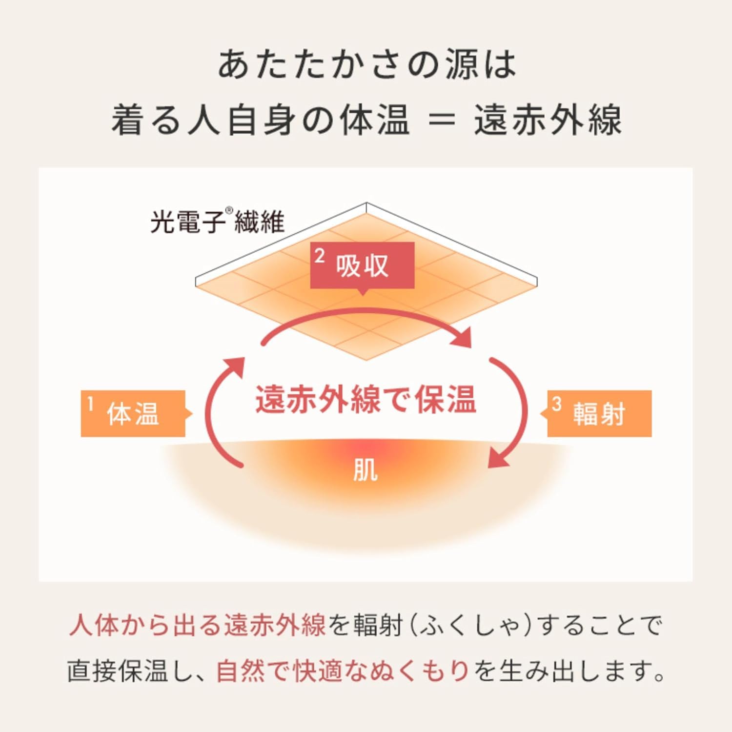 ?【温かいのに蒸れない♪】光電子は遠赤外線を活用して直接人体を「保温」することで快適なぬくもりを生み出し、暑くなりすぎずにあたたかさを自然にキープできる点が、汗などの水分を吸収して発熱する繊維による「加温」との大きな違いです。
