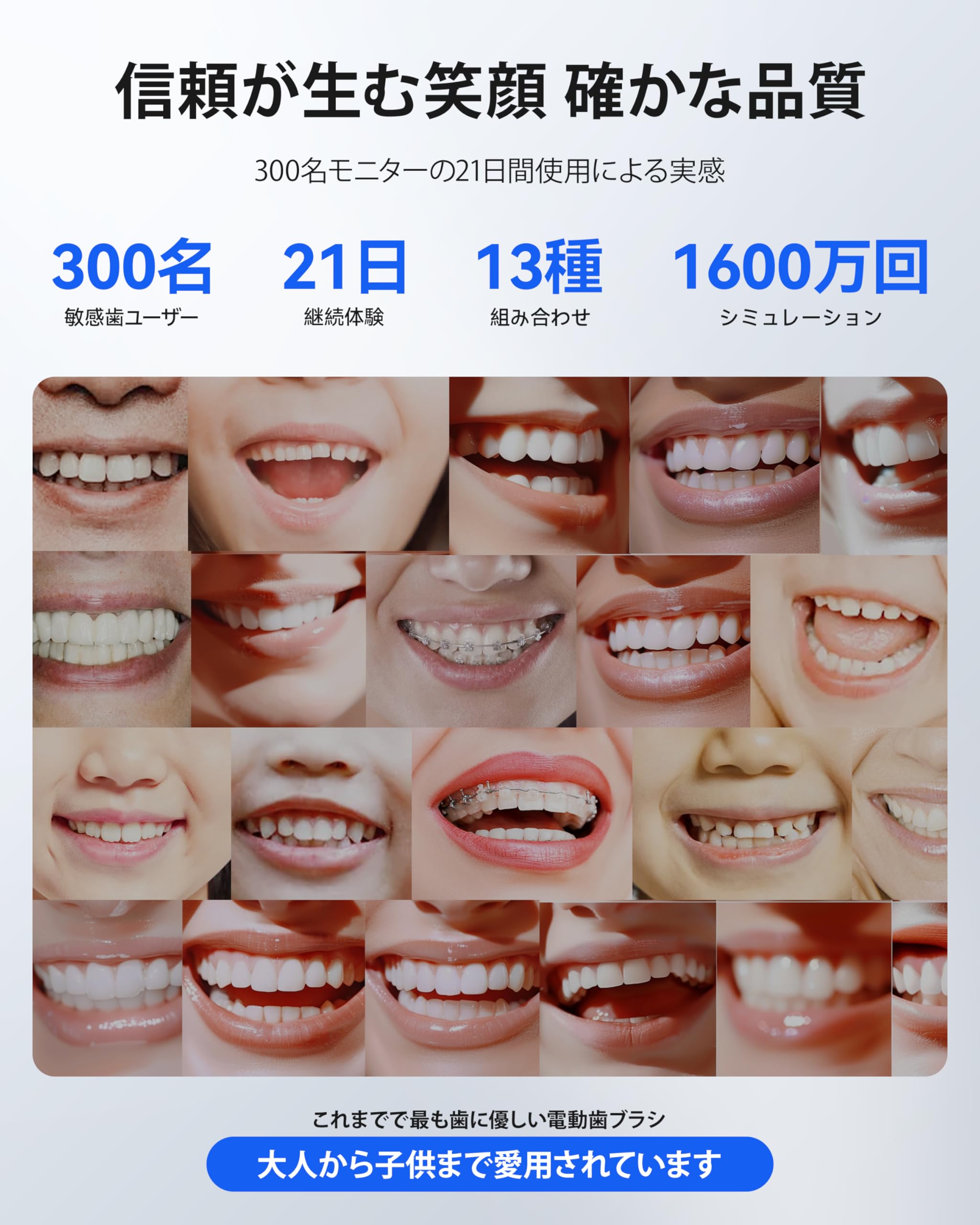【専用のマグネット式充電器 60日間連続使用可能】1600mAhの大容量バッテリーを内蔵し、60日間の連続使用が可能です。長距離旅行でも電力不足の心配はありません。専用のマグネット式充電器が付属しており、便利で安全な充電が可能です。さらに、革新的なABSナノコーティング全面保護のデザインで、IPX7防水性能を実現し、歯ブラシのカビ防止で新品同様の輝きを持続します。