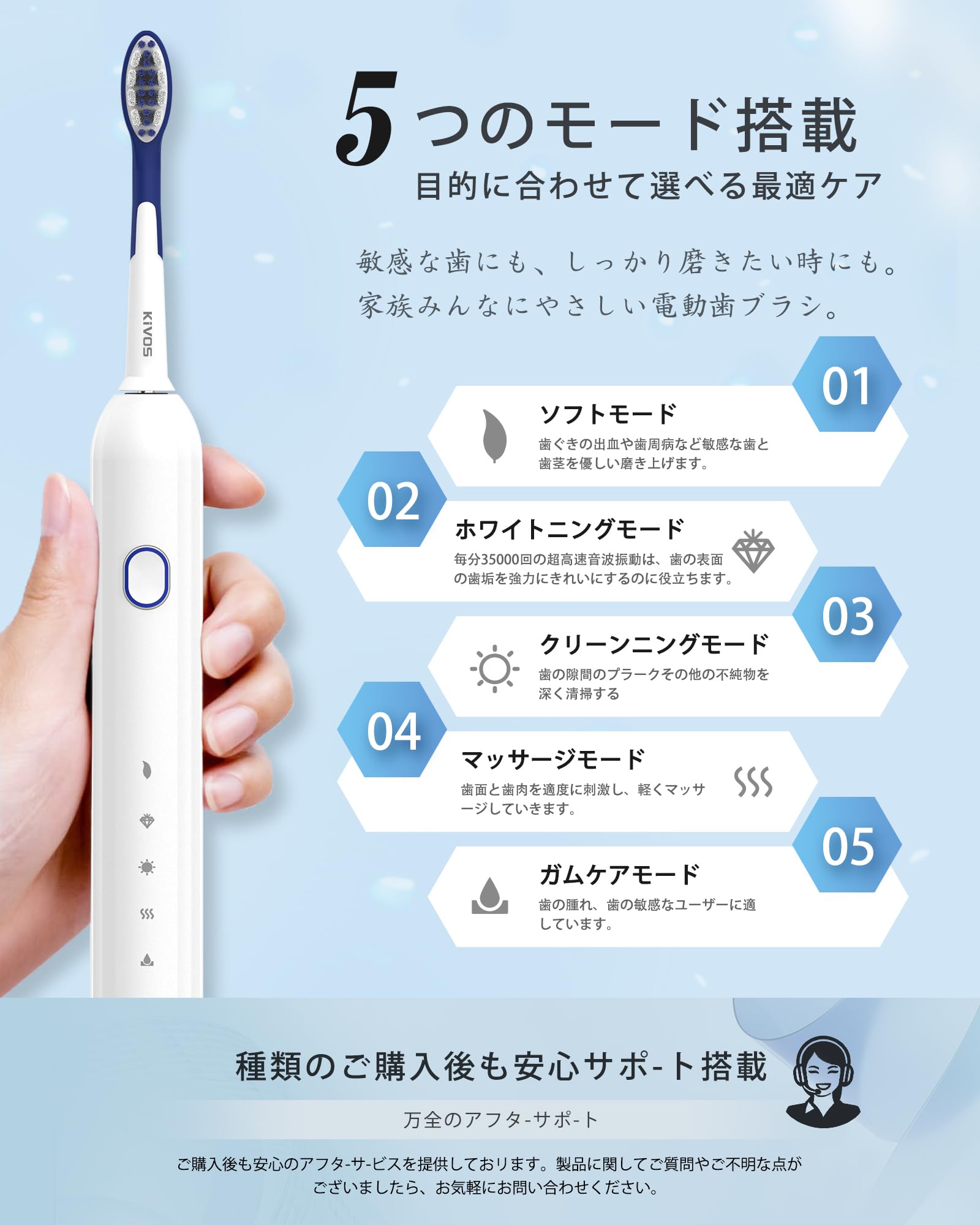 電動歯ブラシ KiVOS 音波歯ブラシ ソニック 4本替えブラシ トラベルケース付き IPX7防水 5モード 歯ブラシ磨き 低ノイズ (ホワイト, SP5)