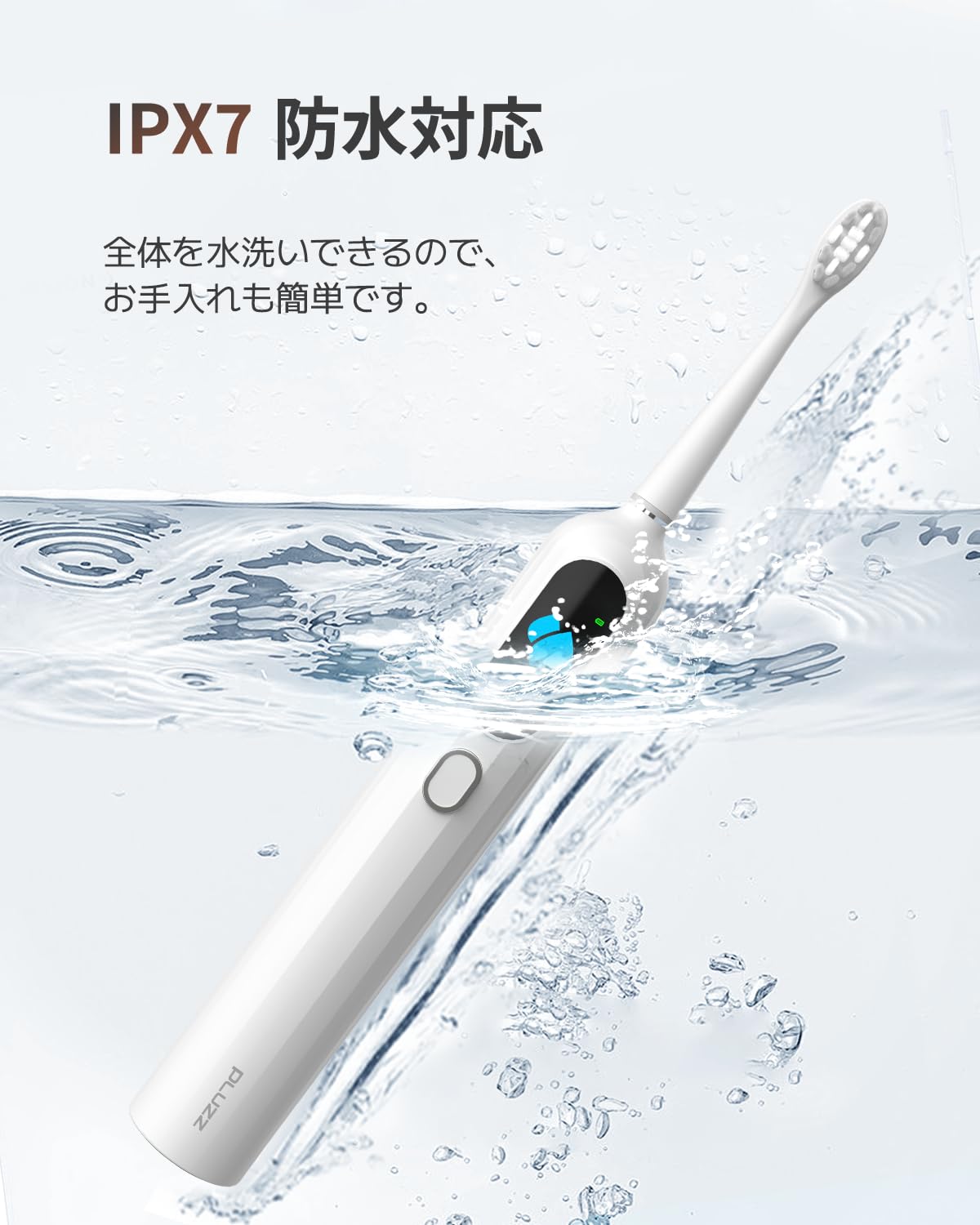 【毎分最大40,000回の音波振動で高効率な清掃を実現】 毎分最大40,000回の音波振動を誇り、歯垢や汚れを効果的に除去します。高速振動が歯間や歯周ポケットの隅々まで届き、手磨きでは届きにくい箇所までしっかりと清掃。歯の表面を滑らかに磨き上げ、より清潔で健康な口腔環境をサポートします。高速音波振動と静音設計(60dB)を採用。IPX7防水機能付きで、シャワーや入浴中でも安心して使えます。