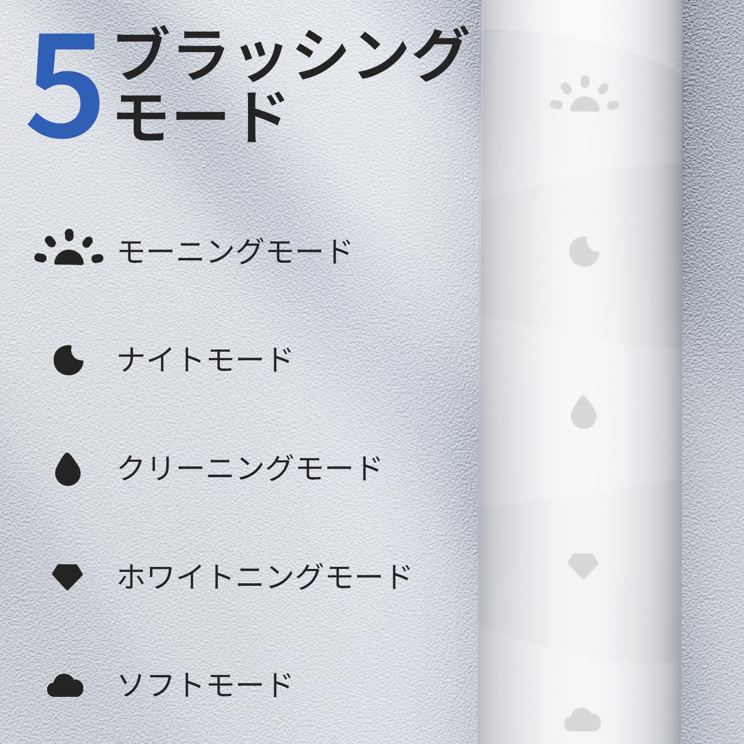 【5つのブラッシングモード】モーニングモード/ナイトモード/クリーニングモード/ホワイトニングモード/ソフトモードの計5つのモードであらゆるニーズに対応。しっかりとした磨き心地のナイトモードやクリーニングモードだけではなく、電動歯ブラシを初めて利用される方や刺激に敏感な方向けのソフトな使い心地のモードも搭載しています。