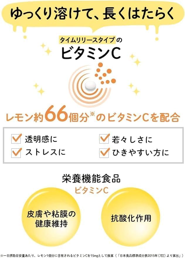 『持続型ビタミンC』は消耗しやすいビタミンCを「タイムリリース処方」にしました。体内でゆっくりと溶け出すので、成分が長い時間とどまるのがポイント。 1000mg※のビタミンC配合で、キレイと元気を効率よくサポートします。※一日摂取目安量あたり