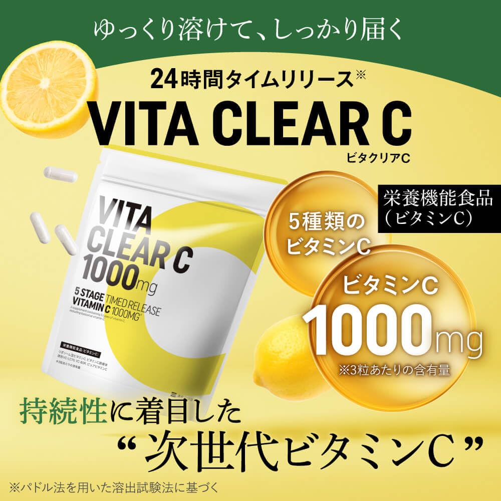 ビタクリアCはビタミンCの栄養機能食品です。1日目安(3粒あたり)レモン50個分に相当する1,000mgのビタミンCを配合。(レモン1個あたりビタミンC20mg換算)