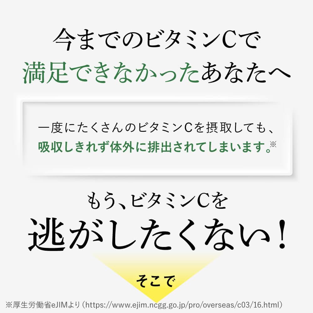 ゆっくり溶けてしっかり届くをコンセプトに5つのビタミンCを配合しました。体外に排出されてしまいやすいビタミンCの欠点を克服。1日3粒でしっかりビタミンC1,000mgを補給できます。