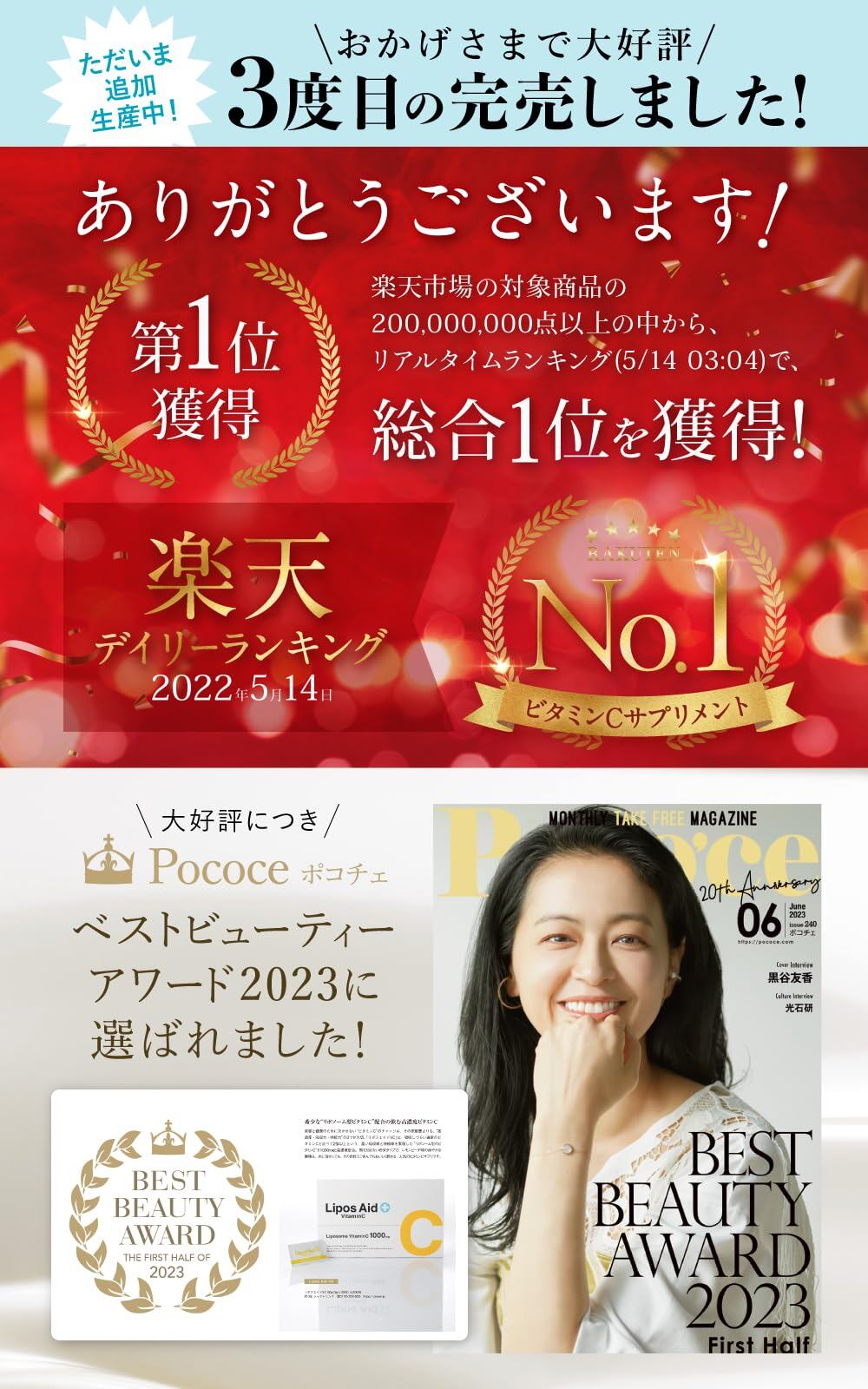 ?ヘルスアドバイザーが使用したいリポソームビタミンC No.1獲得*:自宅で毎日補給できる米国産リポソームビタミンC1000mg配合の飲む高濃度ビタミンC。吸収しやすいリポソーム化されたビタミンCで、手軽に美味しく飲めて続けやすい。有名女性誌にも掲載されたクリニック発想の一滴をご自宅で体験ください。*実施委託先:日本コンシューマーリサーチ 調査期間:2022年4月19日〜4月22日 調査方法:インターネット調査 調査概要:リポソームビタミンCを扱う10社を対象としたブランド名イメージ調査 調査対象:ヘルスアドバイザー326名 順位評価基準:回答数比較