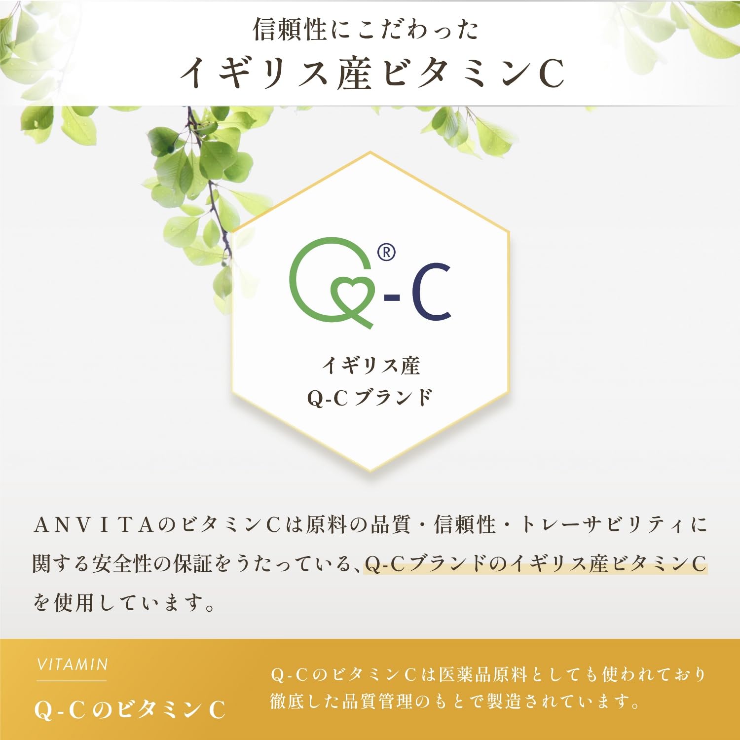 【信頼のビタミンC】ビタミンCは医薬品原料としても使われているイギリス産のQ-C(Quali-C)を使用しています