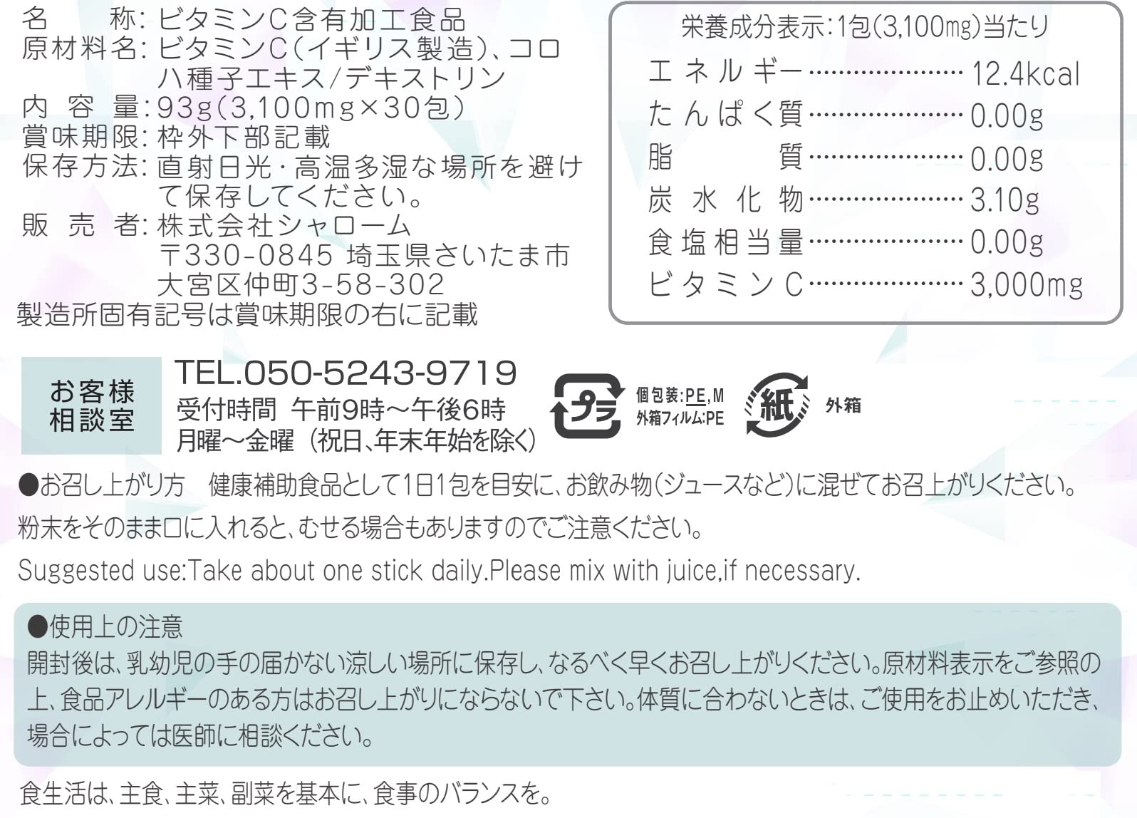 ?【 ?1包にレモン約150個分3000mgのビタミンCを配合? 】高濃度ビタミンC3000mgサプリメントVC(ブイシー)1包にはレモン約150個分のビタミンCが含まれています。※ビタミンC含有菓子の品質表示ガイドラインのレモン1個あたりのビタミンCの基準値20mg/1個に準ずる。