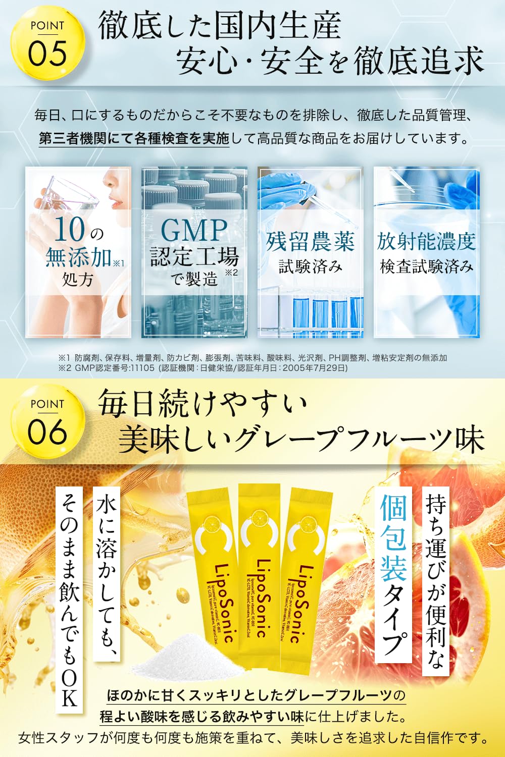 ??【レモン100個分】水溶性ビタミンであるビタミンCは、体内に長期間蓄積されず体外に排出されてしまうので、定期的に接種することがオススメです。リポソニックは、1包でレモン100個分相当のビタミンCを接種できます。