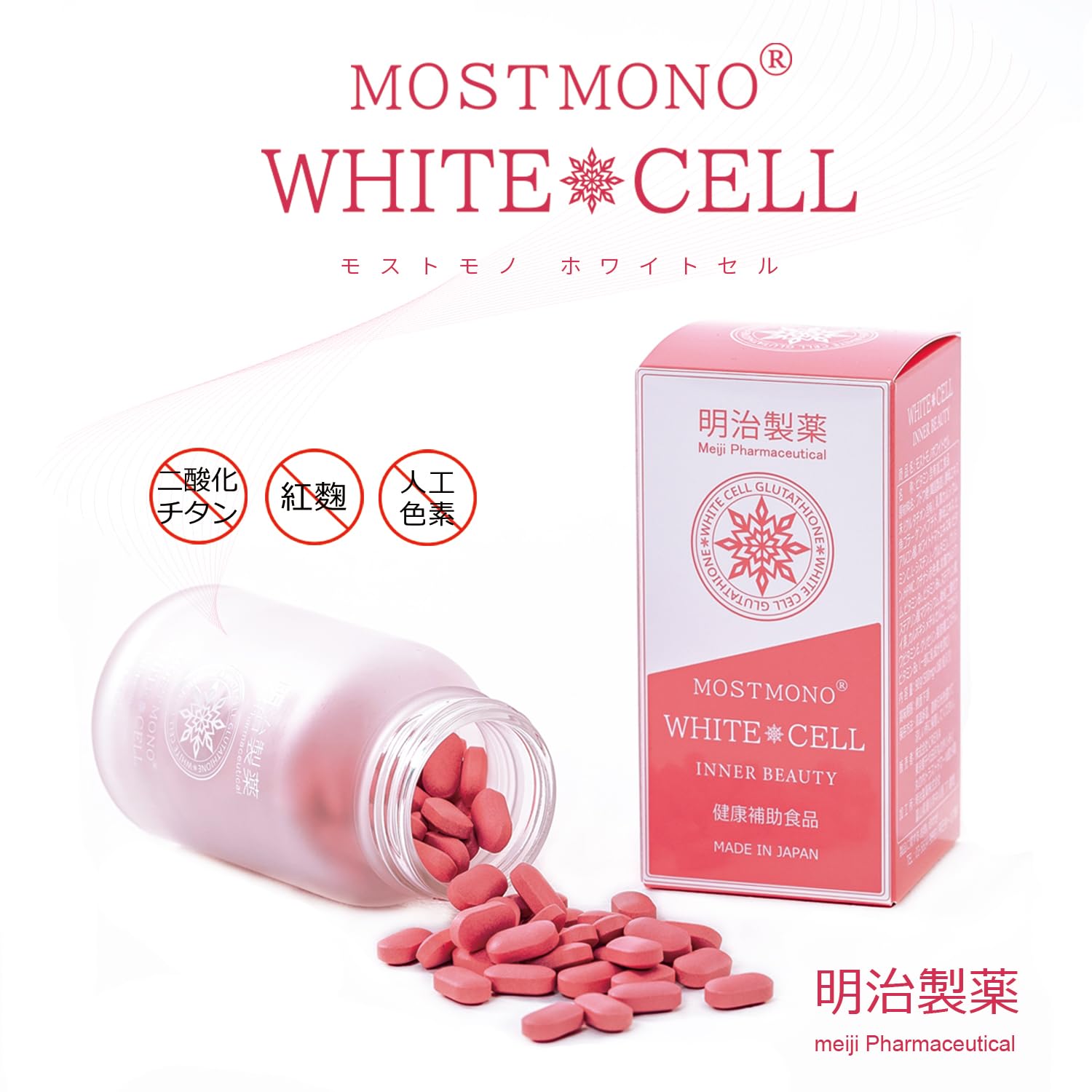 モストモノホワイトセル(Mostmono White cell)は製薬会社との共同開発して明治製薬が 還元型ビタミンC、酵母エキス、ホワイトトマト、低分子魚コラーゲン ペプチド、ヒアルロン酸など厳選した美容成分を配合した日本製の健康補助食品です。