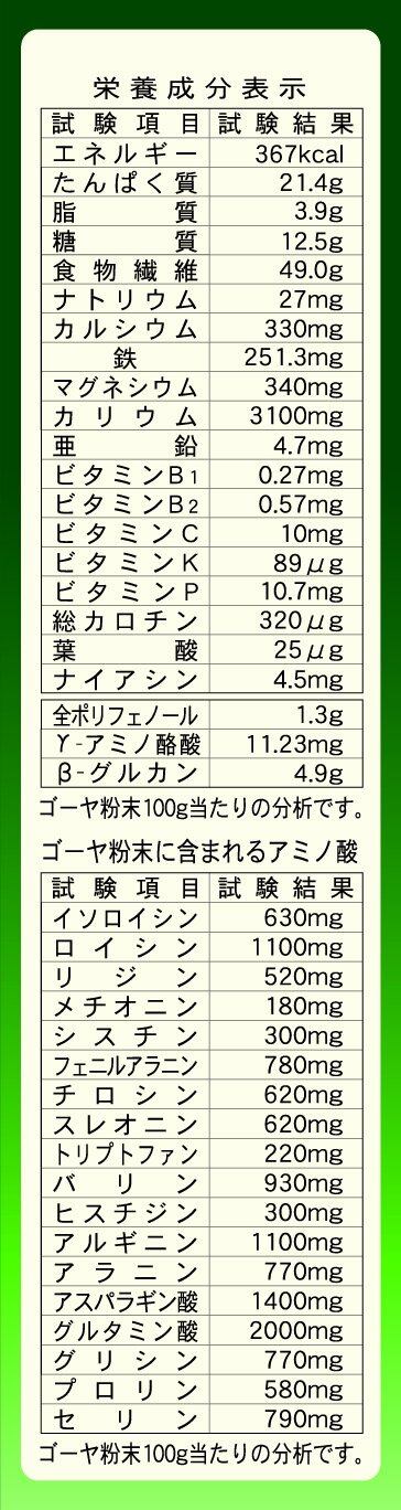 ビタミンCや共役リノール酸を多く含む「種」と「ワタ」も一緒に粉末にし、食物繊維とビタミンCとカルシウムとアミノ酸が豊富な栄養満点のゴーヤ粉末です。