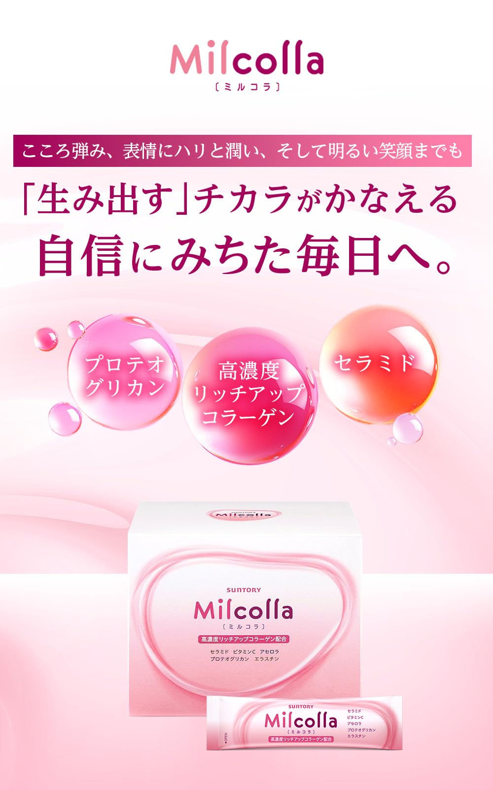 「生み出す」高濃度リッチアップコラーゲンやビタミンC、アセロラなど、贅沢な美容成分を独自配合した美容パウダー『ミルコラ』。 年齢美容のために必要な先進成分を、毎日スティック1包で摂取できます。ハリ、潤いに満ちたくすみのない、輝く毎日・・・ ひとつ上の美しさのために、さぁ『ミルコラ』を始めてみませんか。