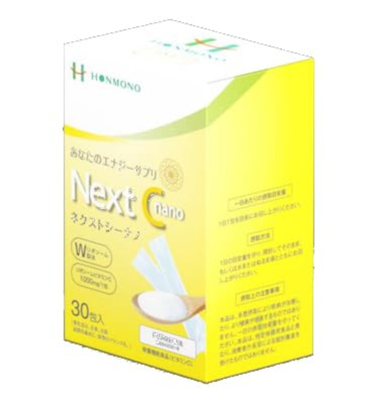 Next C nano(ネクストシーナノ )は、多重層リポソーム化+nanoPDS化による独自のWリポソーム製法でビタミンCを粉末化し、さらにエルゴチオネインとビタミンEを配合した次世代型サプリメントです。 1日1包を目安にお召し上がりください。1日の目安量を守り、開封してそのままお召し上がりください。 甘味料不使用のため、原料由来の酸っぱいお味がします。 酸味が苦手な方は、水や飲み物に混ぜてお召し上がりください。 さらさらのパウダー状なので、色々な食べ物・飲み物に混ぜてもお召し上がりいただけます。 栄養機能食品(ビタミンC) ビタミンCは、皮膚や粘膜の健康維持を助けるとともに、抗酸化作用を持つ栄養素です。 栄養成分表示【1包2gあたり】 熱量 3.42kcal、たんぱく質 0.002g、脂質 0.004g、炭水化物 0.846g、食塩相当量 0.00g、ビタミンC 1000mg(1000%)