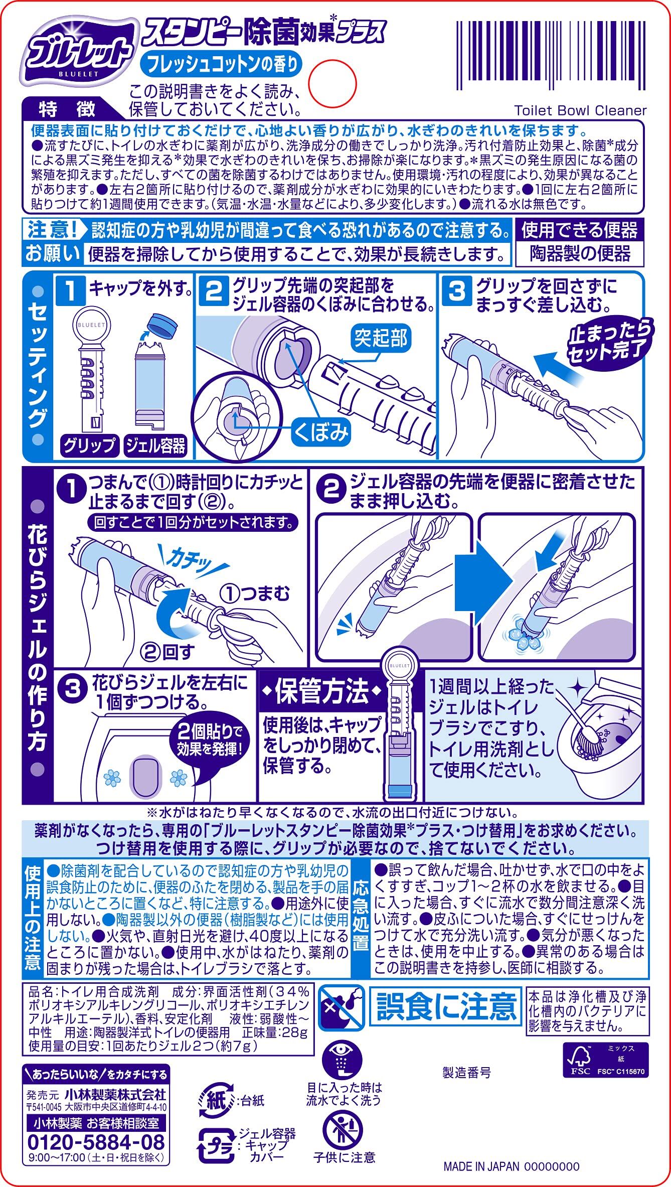 ブルーレット 【まとめ買い】スタンピー 除菌効果プラス トイレ 洗浄剤 フレッシュコットン 本体 約30日分 ×1個+詰め替え用 約90日分×2個 貼るタイプ 流すたび除菌 洗浄