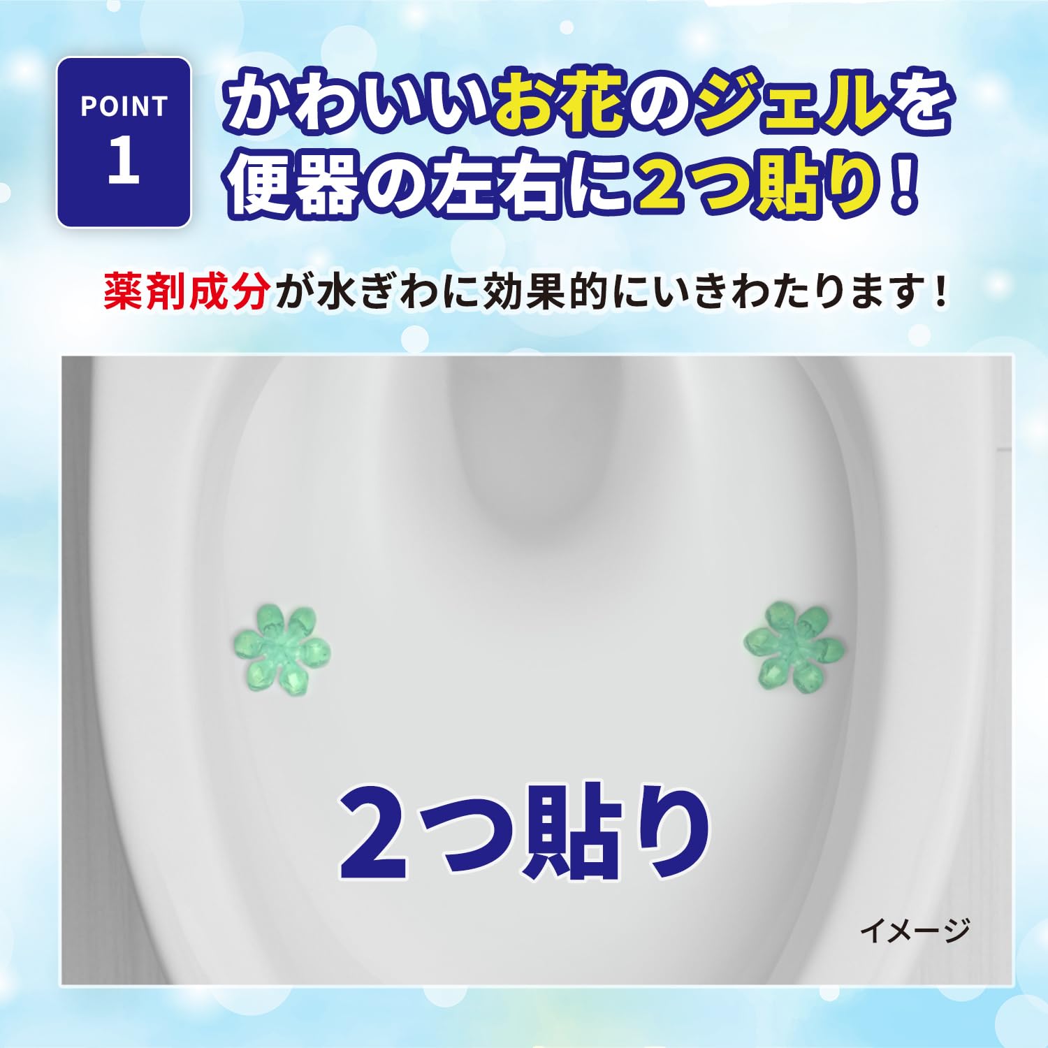 便器表面に貼り付けておくだけで、心地よい香りが広がり、水ぎわのきれいを保ちます。
