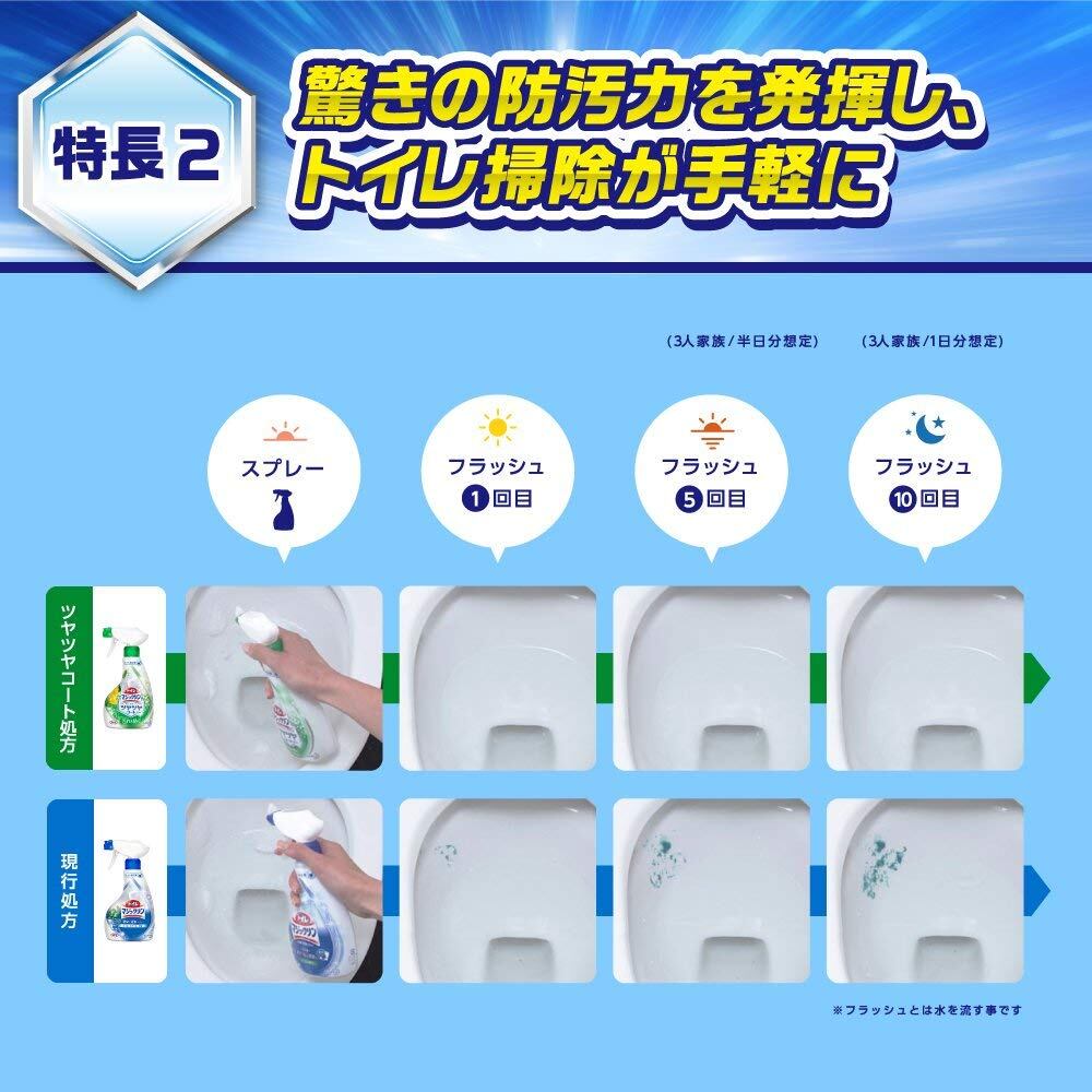 「トイレマジックリン消臭・洗浄スプレーツヤツヤコートプラス」は、シュッとスプレーするだけで汚れをよせつけないコーティングが便器全体に広がり、トイレがツヤツヤな仕上がりになります。