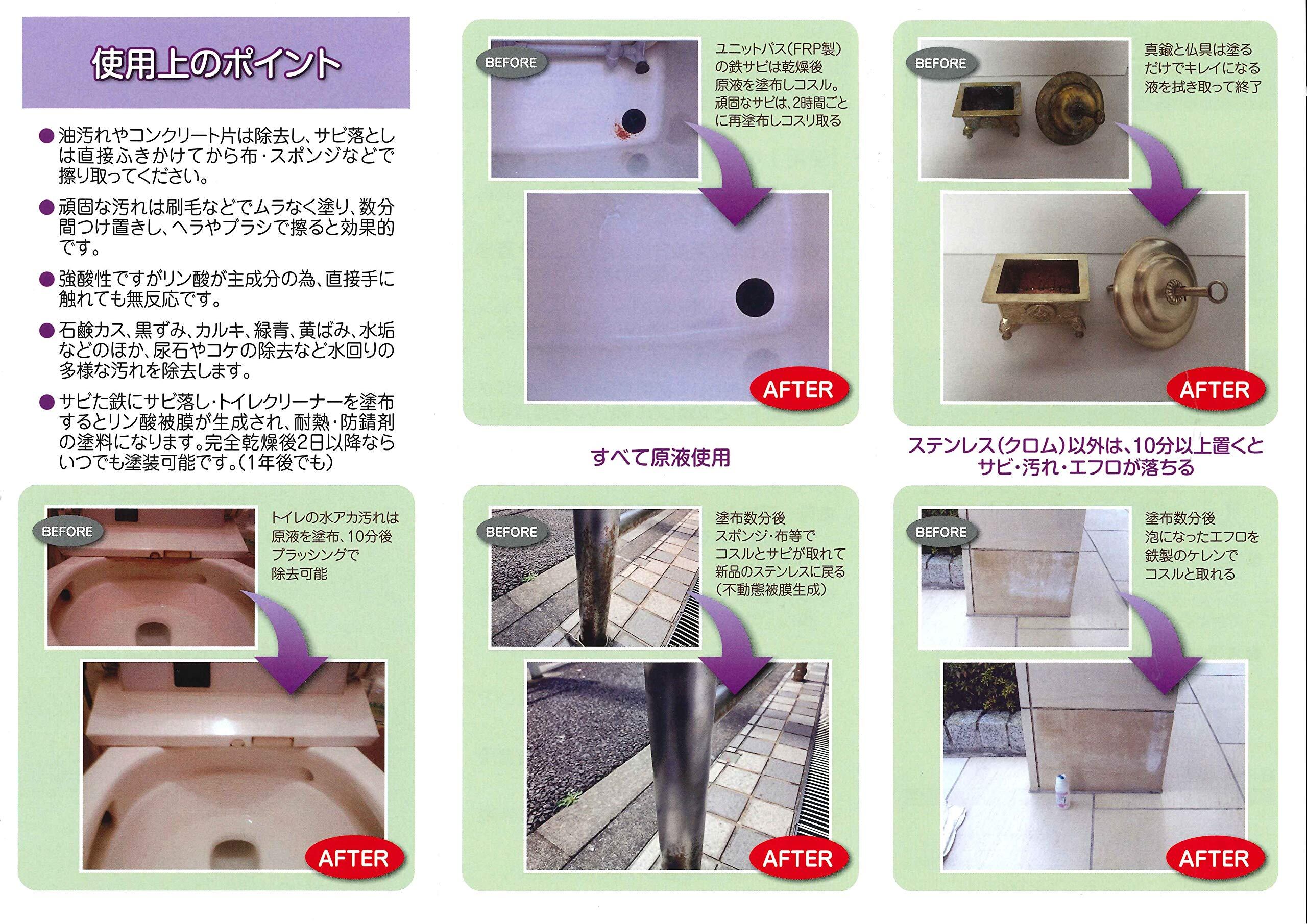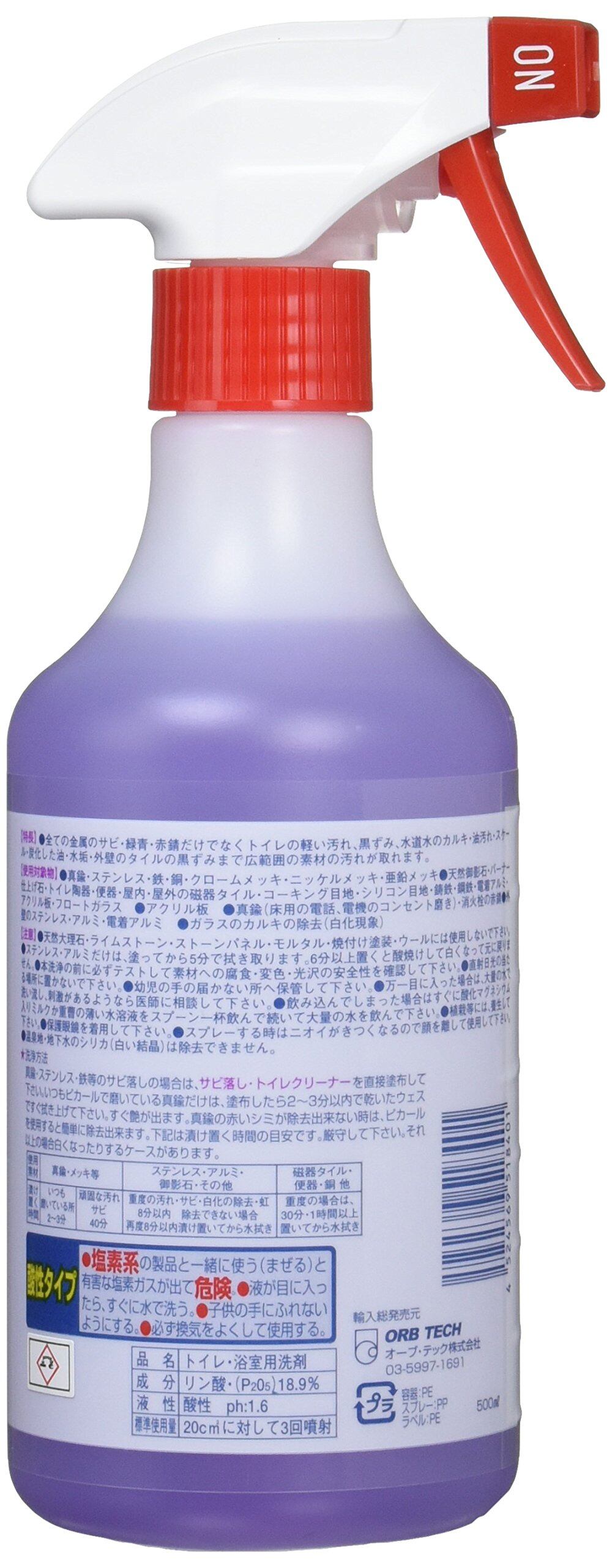 強力な洗浄力と環境への優しさから環境への取り組みに厳しいグリーン企業各社に業務用として採用されているプロ仕様の洗剤です。サビや水まわりの黒ズミ、トイレの尿石に オーブ・テックの洗浄剤 サビ落しトイレクリーナー ガンスプレー付き500cc 1、強酸性のクリーナーですが人の肌に原液が付いても皮膚が赤くなったり痒くなったりしない安全なクリーナーです。2、原液を台所のシンク・風呂場の鏡の白いウロコ・カルキ・石鹸カス・黒ずみに塗り10分経ってから スポンジ等で擦ると除去出来ます。1回目で少し落ちるようであれば数回やれば綺麗になります。 FRPの浴槽のサビは2時間以上置くと消えます。3、銀以外の金属のサビは、原液を塗布して擦るとサビが取れます。錆び具合によっては、5分から30分ぐらい掛かります。 用途:シンク・水まわりの金属全般・ドアの金属ポスト・サッシ・オートバイ・自転車・自動車など洗浄力が強いのに安心安全。アメリカのエルスコ社が開発。素手で作業可。塗って水をかけ拭き取るだけ。真鍮やメッキなら早ければ数秒できれいに。防錆効果も有りふきつけてこすり落とすとガンコな汚れがぴかぴか に!
