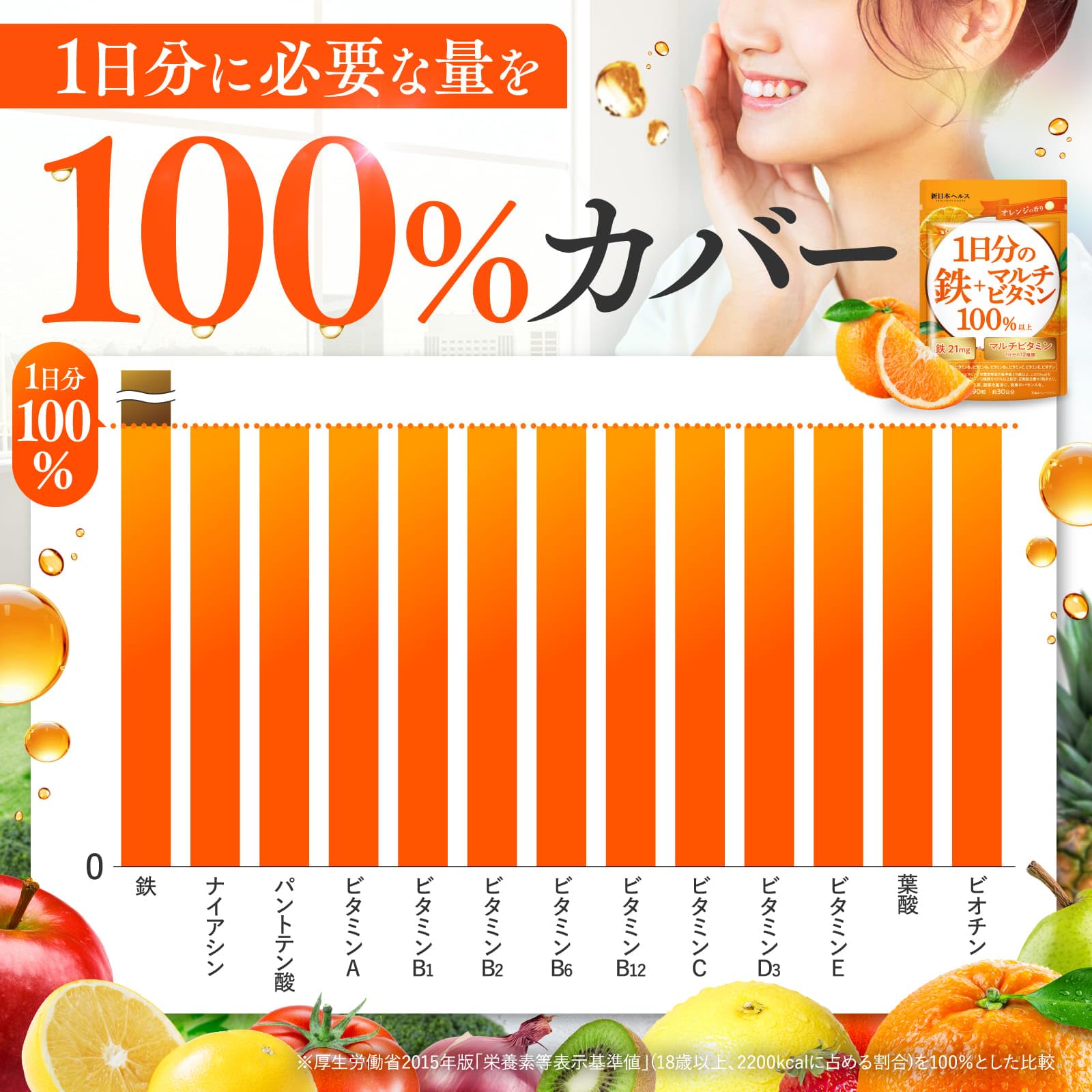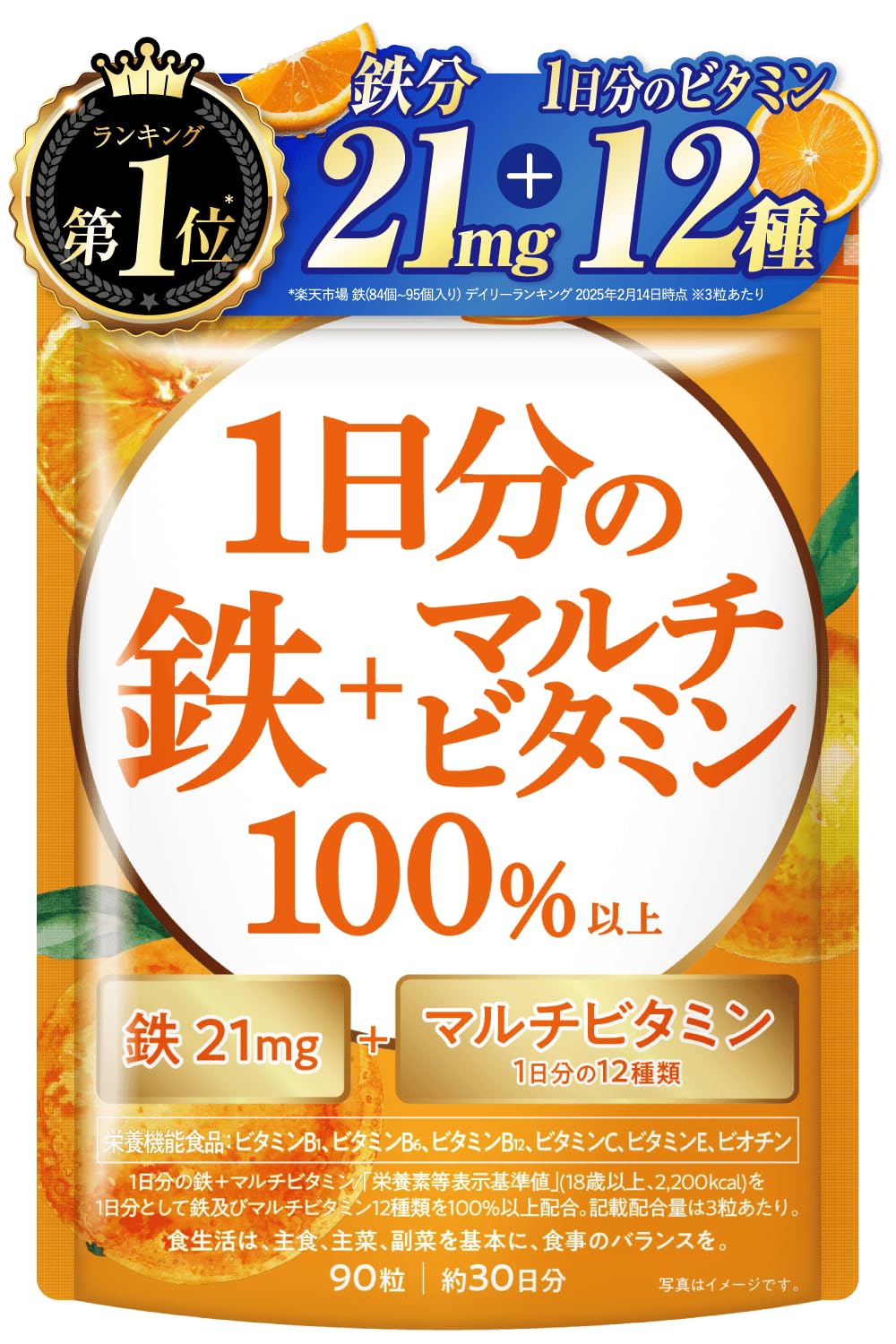 【2022最新】1日分の鉄分21mg × マルチビタミン12種 1日分のビタミン12種100% 鉄分 サプリ サプリメント GMP認定国内工場 栄養機能食品 90粒 30日分 オレンジの香り 新日本ヘルス | Lumisfera