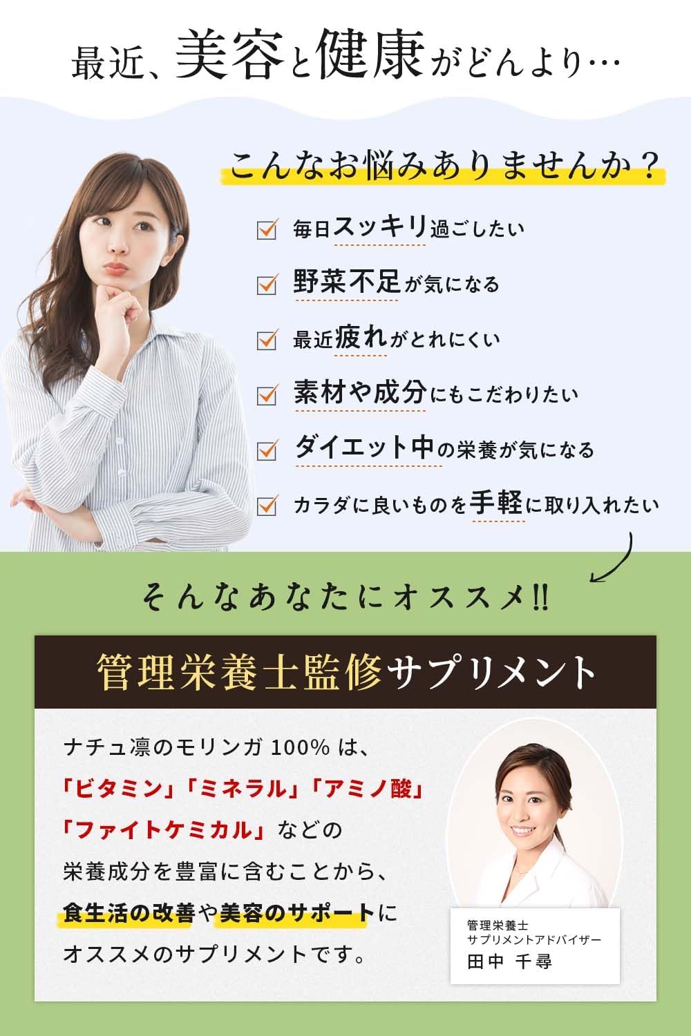 ?【 毎日の健康と美容にモリンガ100% 】ナチュ凛のモリンガサプリは、毎日家事や仕事で忙しい女性に最も愛用される健康食品を目指しました。90種類以上の天然栄養成分で、お手軽に健康と美容をサポートします。* ・