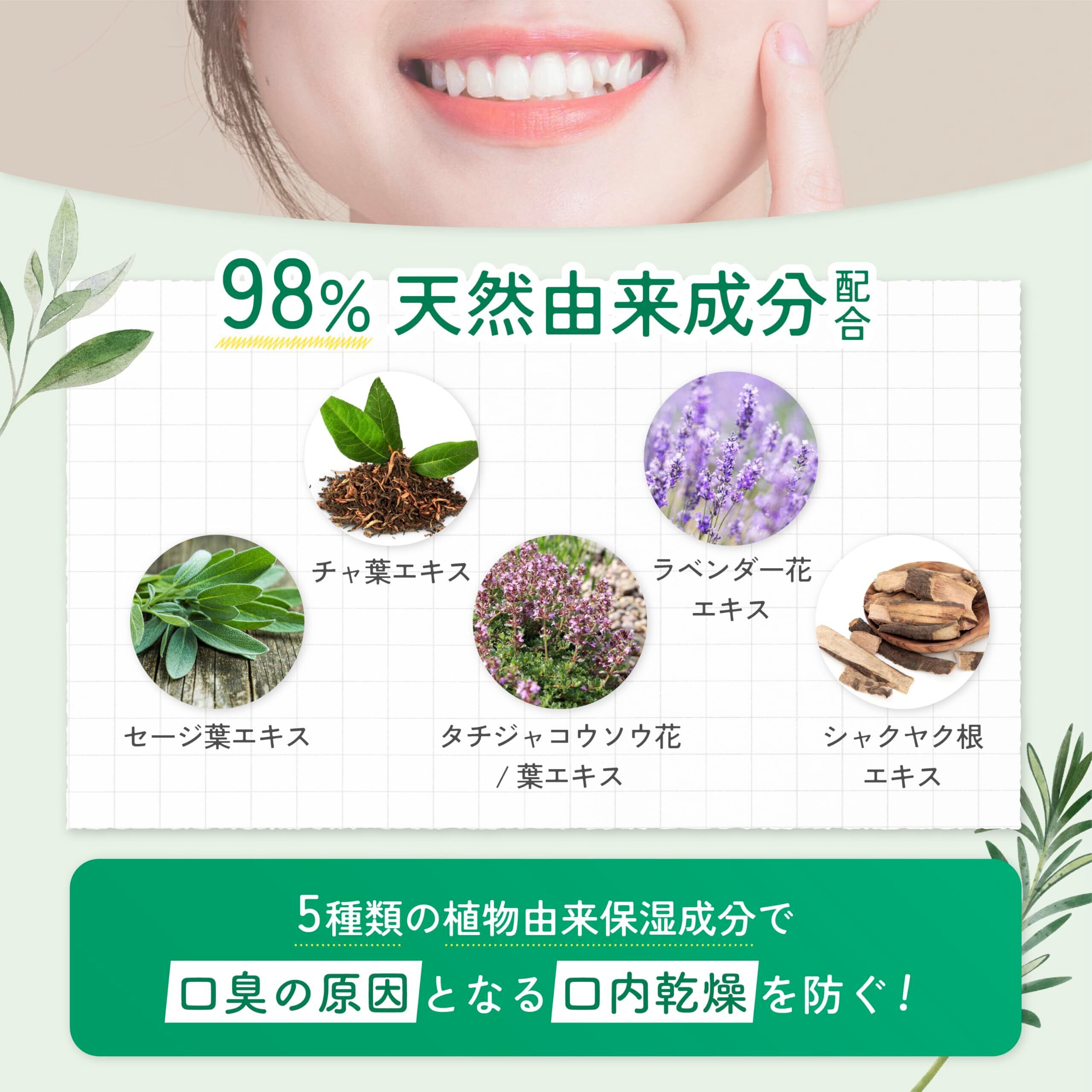 【98%天然由来成分配合*マウスウォッシュ】 98%天然由来成分配合なので、ピリピリ感が少なくマイルドな使い心地です。 初めての方やピリピリ感が苦手な方、お子様などご家族全員でご使用いただけます。
