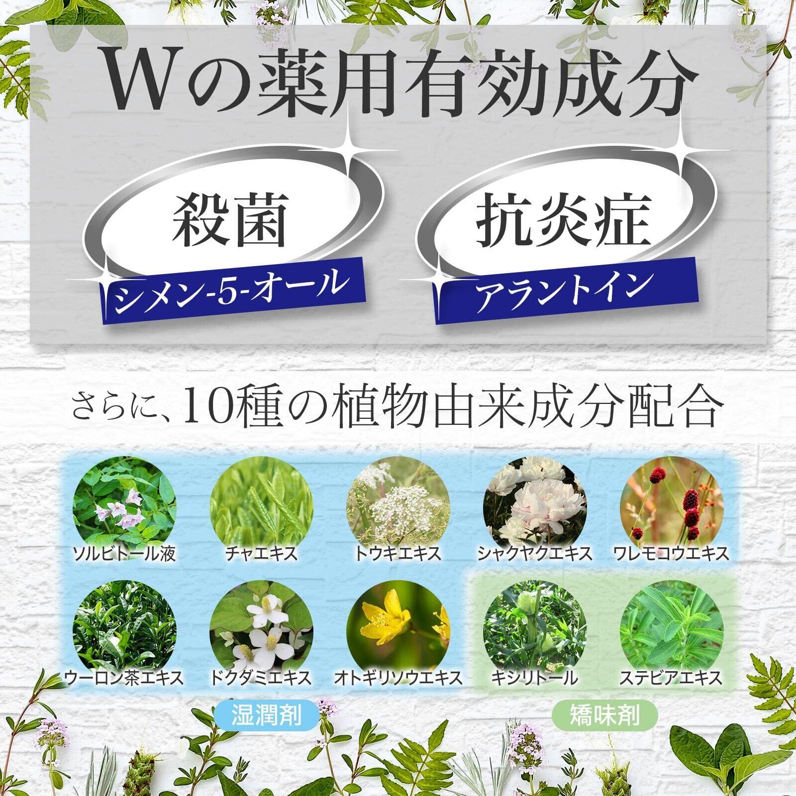 (基剤) 精製水 (湿潤剤) ソルビトール液、茶エキス-1、トウキエキス-1、シャクヤクエキス、ワレモコウエキス、ウーロン茶エキス、ドクダミエキス、オトギリソウエキス、BG (清涼剤) エタノール、メントール、無水エタノール (矯味剤) キシリトール、ステビアエキス (pH 調整剤) 無水クエン酸、クエン酸Na (保存剤) メチルパラベン (薬用成分) アラントイン、シメン-5- オール (着色剤) カラメル
