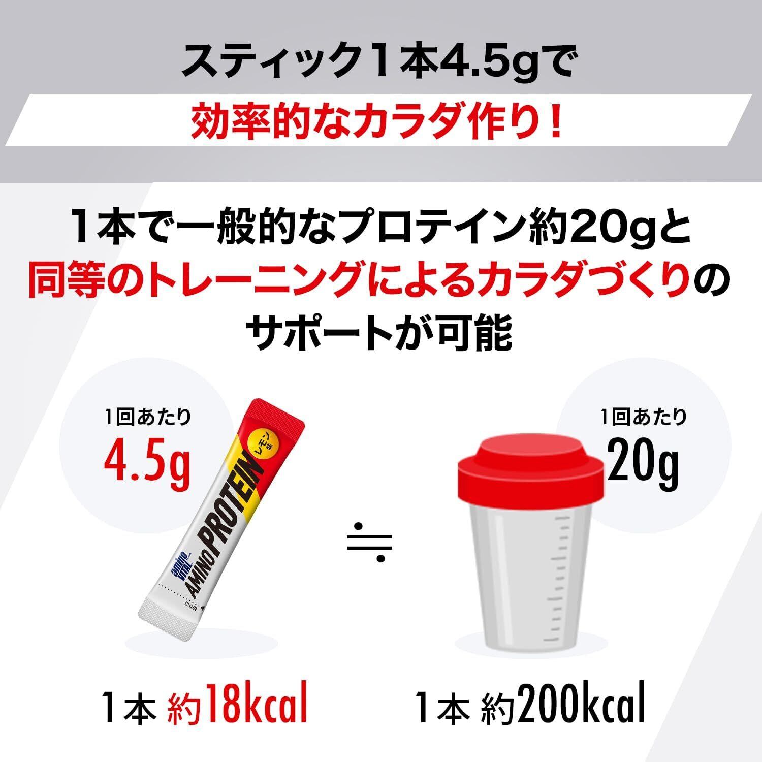 ホエイプロテインとEAA、BCAAを配合した、スティック入りのプロテインです。シェイカー不要で1回分がスティック1本(約4.5g)なので、計量不要かつ便利に持ち運ぶことが出来ます。