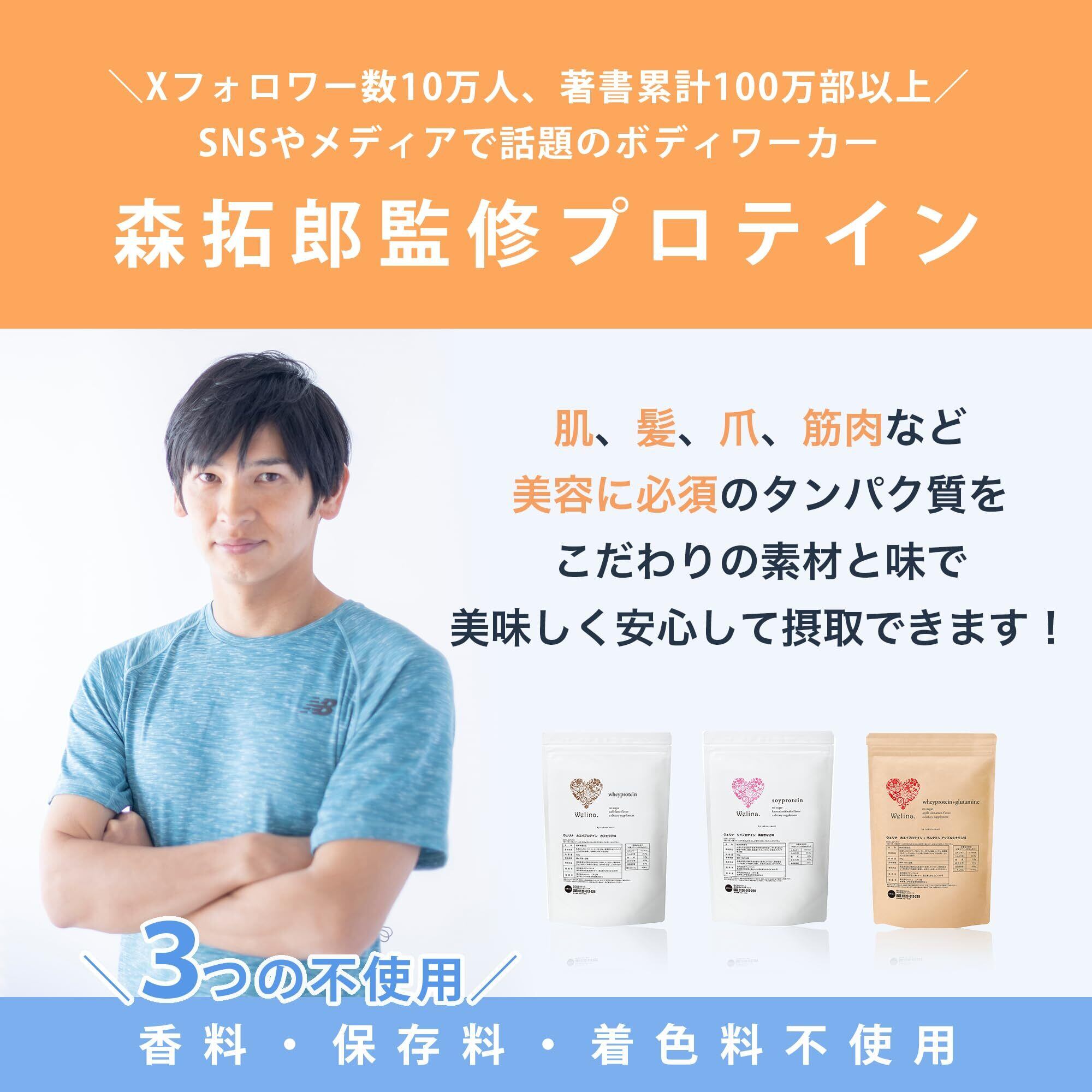 【森拓郎氏プロデュース!】女性らしい身体作り、美容と健康が気になる女性が積極的に飲み続けられるプロテインを提供したいという想いから開発された製品です。素材や味にこだわり、女性の健やかな毎日を応援するプロテインを作りました。
