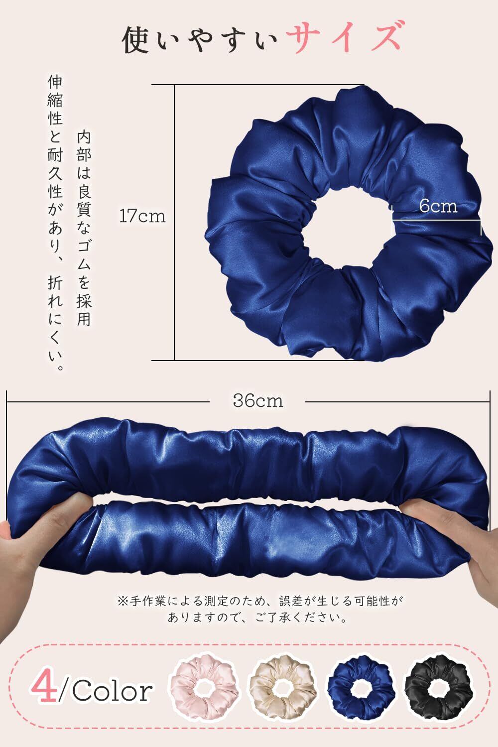 【高品質なシルクシュシュ】縫い目がきれいです!シルク100%の高級生地で、丁寧に縫製して仕立てました。ヘアスタイルが華やかになることはもちろん、強く結んでも傷みにくく、髪の毛に跡がつきにくい。いつものヘアスタイルのアクセントに!
