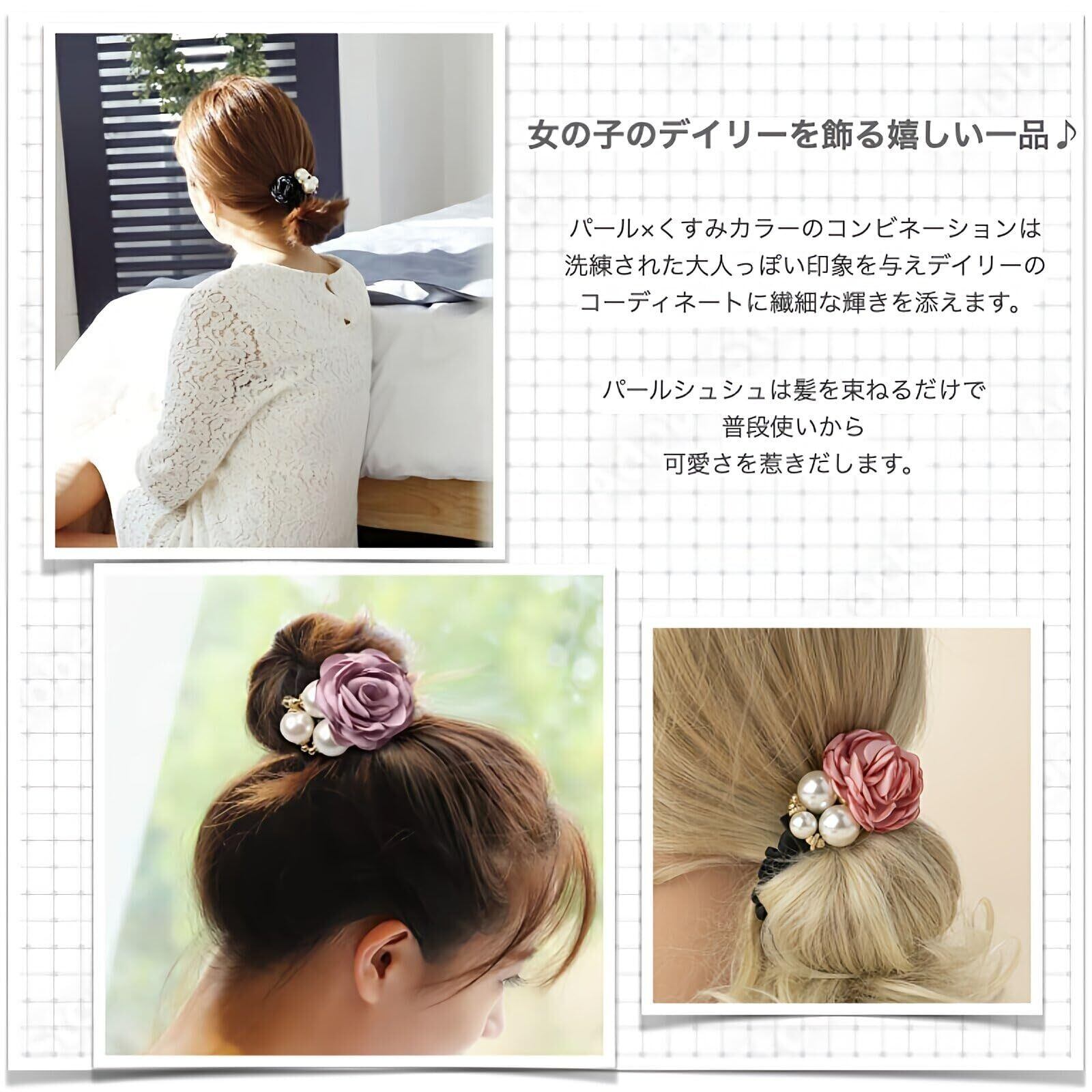 色鮮やかな薔薇とパールが上品さを演出するチャーム付きシュシュ