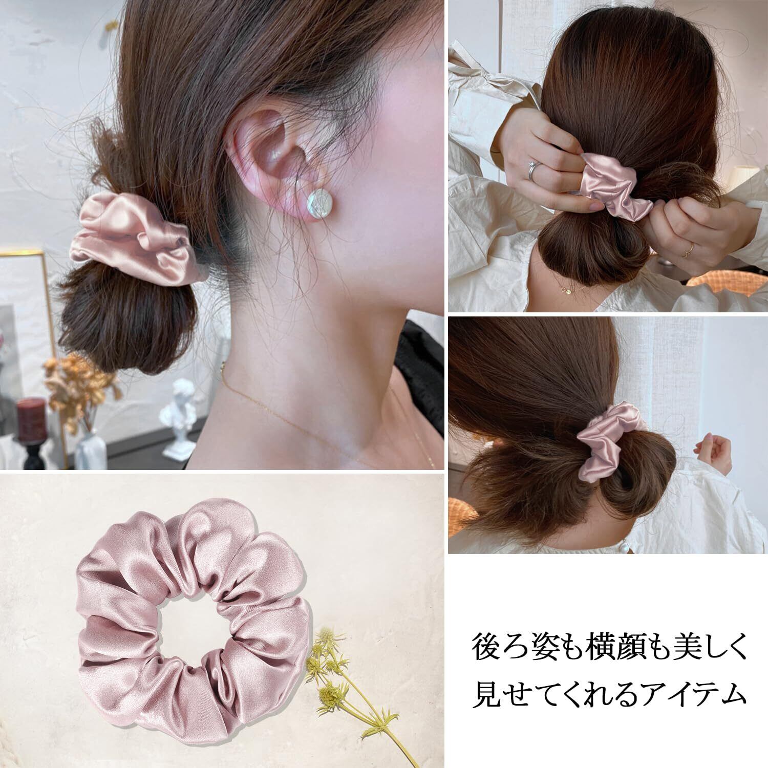 【高級感のあるシルクシュシュ】ふわふわボリューム、ツルツルな光沢、極上の肌触り、毎日使っても表面に毛玉が出来ません!上質なシルクにゴムを通した「シュシュ」、ヘアゴムとは一味違った華やかな印象のヘアスタイルを作ることができます!