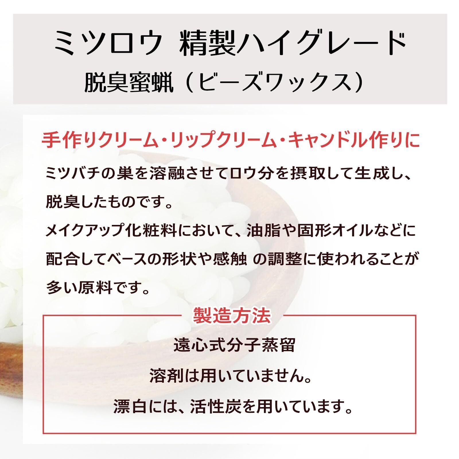 ・グレード: 化粧品グレード (日本薬局方 サラシミツロウ該当品)
