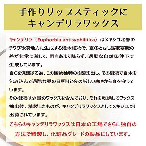 キャンデリラワックスは、口紅に光沢を増し、軟膏や固めのクリーム、固い石けんを作るのに適しています。 口紅やリップクリームには、全体量 25%程度までの配合。 石けんは全体量 2%程度までの配合。クリームや軟膏には、15%程度までの配合。