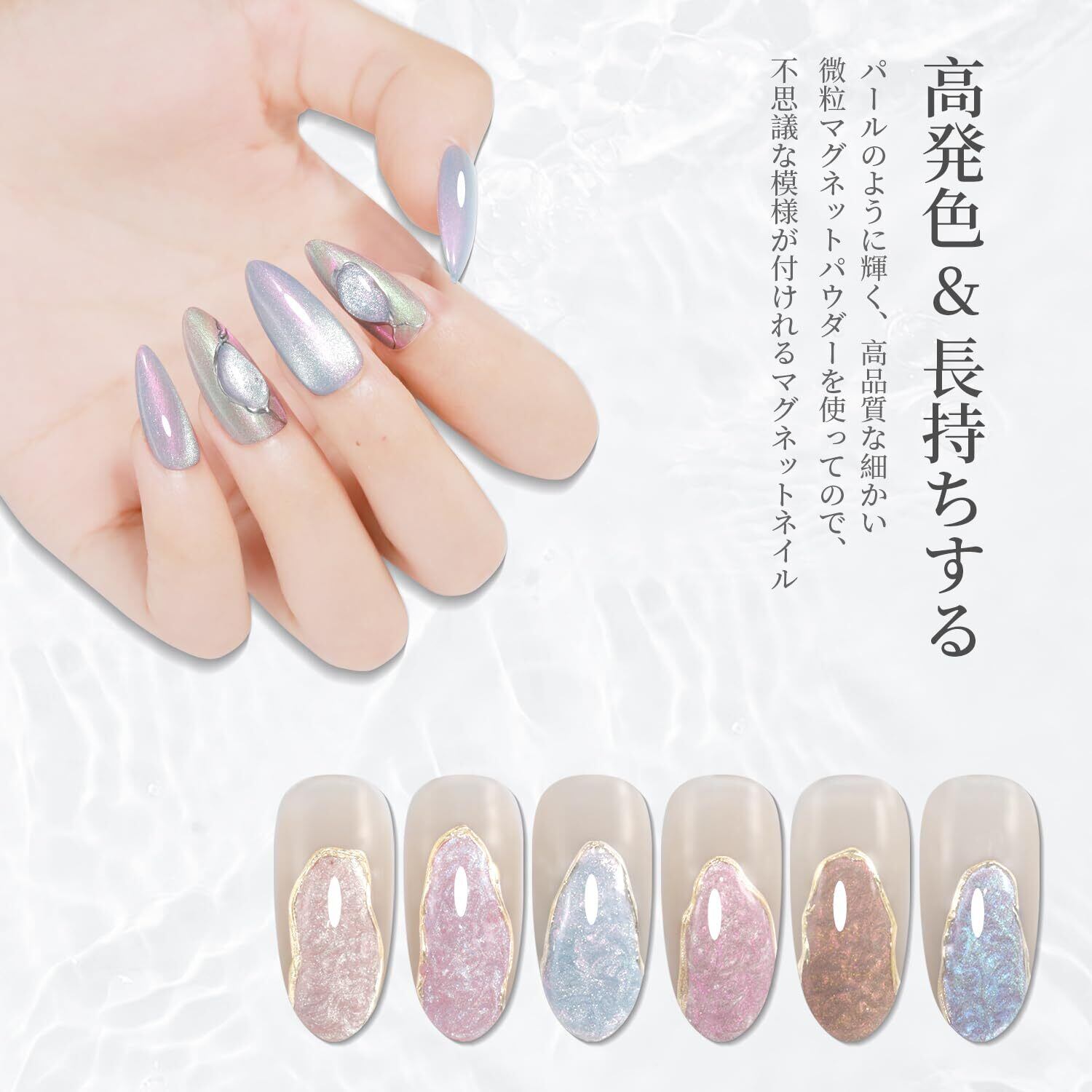 【パールのように輝く】パールのように輝く、高品質な細かい微粒マグネットパウダーを使ってので、不思議な模様が付けれるマグネットネイル。商品仕様:6本*10ml 磁石*1