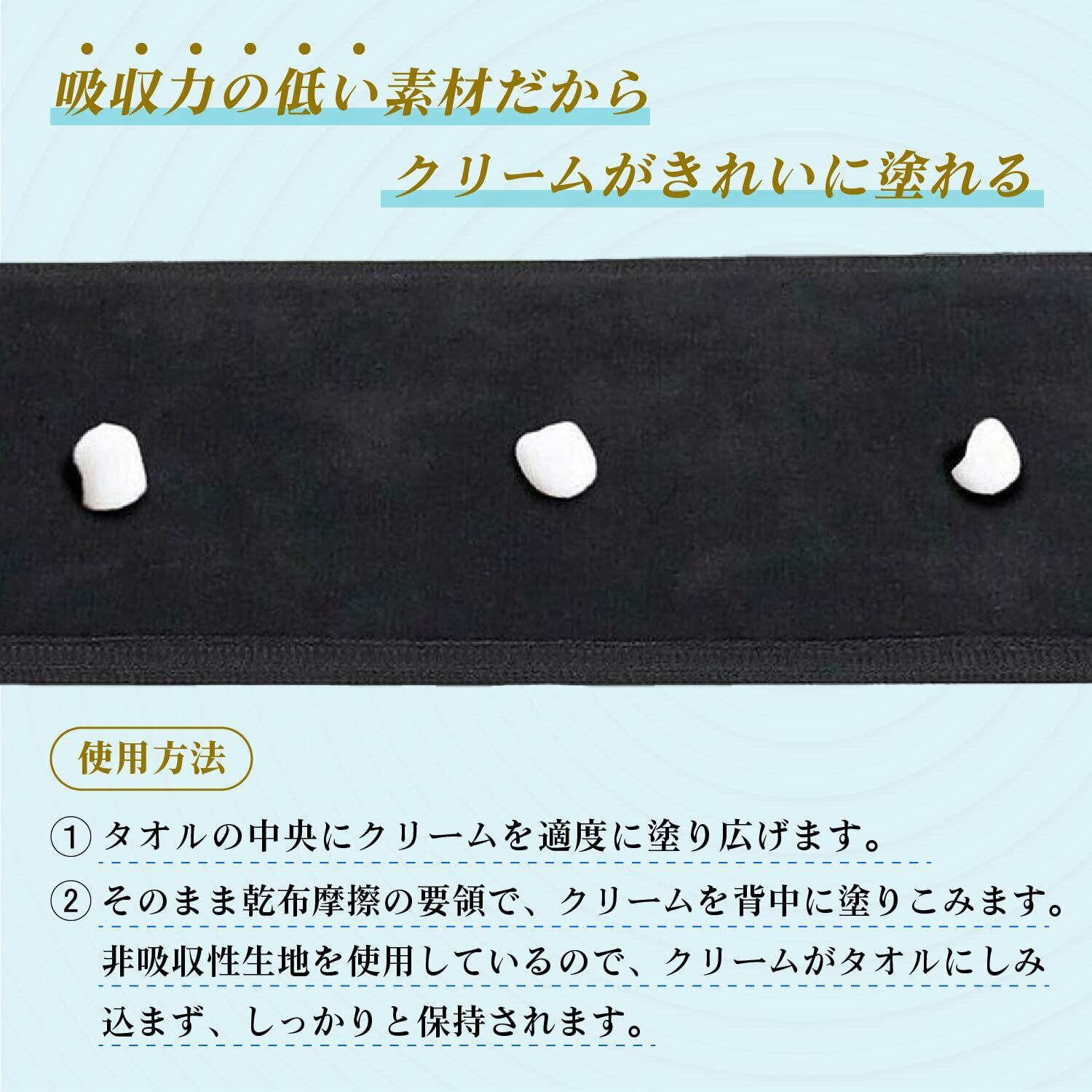 【背中の手の届かない場所に薬を塗れる!】 本製品は、背中の手の届かない場所にクリームや日焼け止めをムラなく塗ることができる画期的なタオルです。